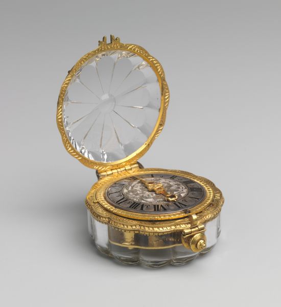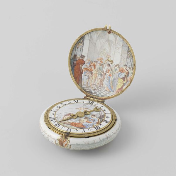 This early 18th-century watch was crafted by Johannes van Ceulen, a Dutch clockmaker. Its circular form is immediately striking, framed by ornate gold and enamel work. Opening the watch reveals a pastoral scene painted on the inside of the lid, in contrast to the functional face. The watch presents a tension between decoration and utility, between the measurement of time and the timelessness of art. The exterior's intricate floral patterns and the interior's idyllic landscape reflect the period's interest in ornamentation and its connection to nature. The scene may evoke a sense of nostalgia, transporting the viewer to a serene, almost dreamlike state, starkly contrasted with the watch’s precise function. Consider how the artist juxtaposed these elements, inviting us to reflect on time's passage and humanity’s place within it. Meaning in art is continually reshaped by our interpretations across time.