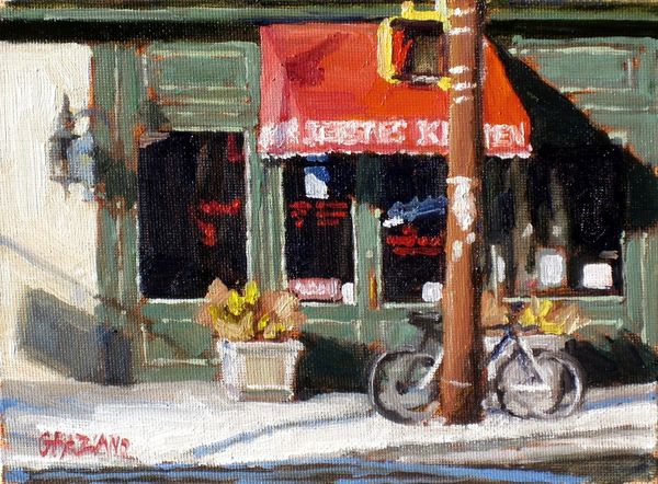 Dan Graziano made "Charlie's Grocery" with oil paint on canvas. The paint handling is direct, even a little brusque. We see it in the way Graziano renders the light, which is not polished or idealized, but instead captures the everyday reality of a neighborhood shop. The texture of the paint gives a weight and presence to the scene, creating a sense of immediacy. It’s clear the artist has chosen his materials to capture an impression of the ordinary, the fleeting, and the authentic. The painting process can also be seen as a kind of labor, with each brushstroke contributing to the overall image. Graziano's approach is rooted in a tradition of observational painting, where the artist engages directly with the world around them, and the daily scenes that may be overlooked. By highlighting the materials, the making, and the context of the work, we can understand how Graziano elevates the everyday, asking us to reconsider the value and significance of the world around us.