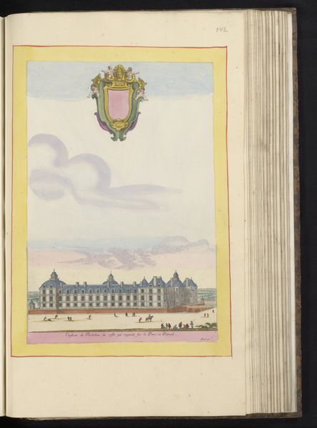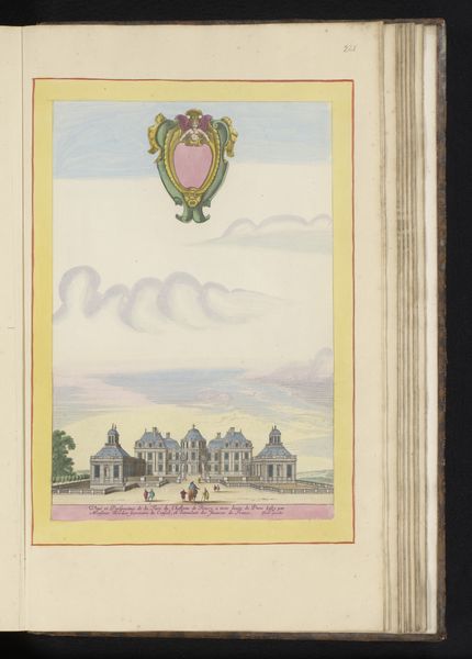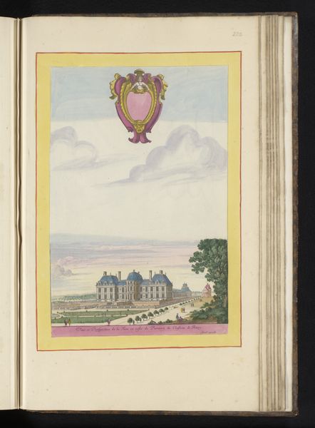 Curator: Standing before us, we have "View of the Hôtel de Soissons in Paris" created sometime between 1631 and 1661 by Israel Silvestre. The Rijksmuseum proudly holds this drawing which uses watercolor and pencil. What catches your eye first? Editor: Definitely that soft palette – pastels floating like memories. And then the meticulous detail. I see layers, not just in the color washes, but in the societal layers represented, right? The labor involved to build that palace, maintain those gardens… all visualized in strokes. Curator: Absolutely, you're hinting at the material conditions right away. The Hôtel de Soissons was quite a hub, especially due to Catherine de Medici’s patronage. But isn't it curious how Silvestre floats that almost cartoonish coat-of-arms above? A bit cheeky, like poking fun at the very grandeur he's depicting. Editor: Cheeky, yes, but also strategic. These visual representations of power–they aren’t simply about artistry, but propaganda, and justifying social hierarchies through aesthetics. Who commissioned this piece? Who benefits from this idealised view of labour and status? I would be very interested in original documents around the commision. Curator: Sadly, direct commission details are a bit murky for this piece. But the purpose resonates with print culture trends during that time: spreading ideas, projecting power... What gets me is the artist's ability to give form to these sprawling gardens. There's a real lightness, despite all that stone. How does the process—drawing with pencil, and applying washes of watercolor— affect your impression of this depiction of place and leisure? Editor: I appreciate how he delineates the architecture but blurs boundaries through watery techniques. This interplay, though simple, destabilizes the apparent solidity of wealth by foregrounding the tools employed in representing wealth. To make a print, after all, involved laborers to manufacture the paper, pigments, etc. Curator: Indeed! It adds to the complexity. So much to contemplate within one carefully rendered sheet of paper. The layers—aesthetic, historical, and socio-economic—begin to intertwine rather seamlessly. Editor: Yes, from pigment to power. A picture's worth a thousand realities. Thank you for bringing us here, it opens a range of perspectives.