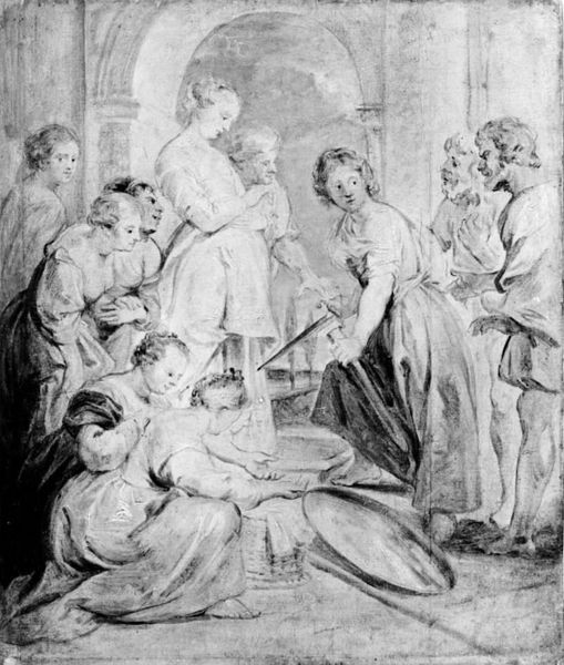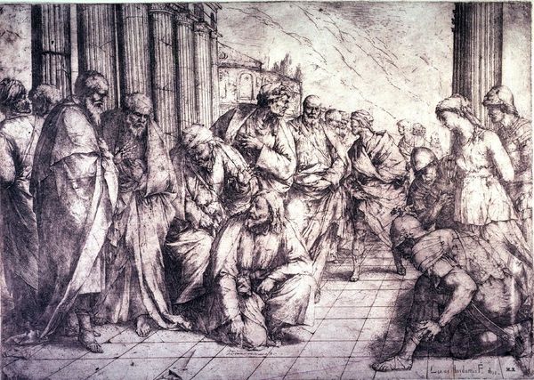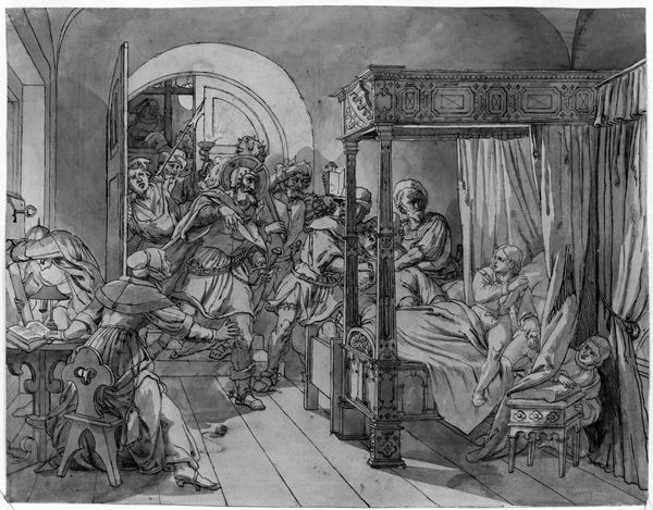 Editor: This is Orest Kiprensky’s "Tobias and his blind father," made around 1800, using pen, pencil, and ink. The heavy linework and stark contrast give it a dramatic flair, even though it's just a sketch. What's striking to you about the composition? Curator: Observe how Kiprensky orchestrates the composition around contrasting light and shadow, a study in chiaroscuro. Notice the dense clusters of figures contrasted against the bareness of the architectural space. This visual weighting serves to intensify the emotional impact of the scene. Editor: I see that! The figures are so tightly packed together, while the background is much more open. What do you make of the lines themselves? They seem so…energetic. Curator: Indeed. Kiprensky employs line not just to delineate form but to suggest movement and emotional energy. Look at the hatching and cross-hatching; the varying thickness and direction of the lines contribute to the overall sense of dynamism and unrest. Are there any elements in particular that stand out because of their specific treatment? Editor: Definitely the wings on the angel—they almost vibrate with the energy you’re talking about! It gives them a sense of otherworldly power, even in this raw sketch. Curator: Precisely! Kiprensky uses formal means to generate meaning, investing the sketch with potent symbolic value through careful manipulation of visual elements. Consider also how this dynamism reinforces the narrative, capturing a moment of high emotion. Editor: I see now how even in a preliminary sketch, Kiprensky uses line and contrast to build a compelling and emotionally charged scene. I hadn’t considered how much the purely visual elements contribute to the narrative power. Curator: A successful analysis hinges on recognizing the profound interconnectedness between form and content, which we have certainly found in Kiprensky's work.