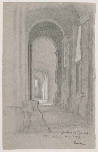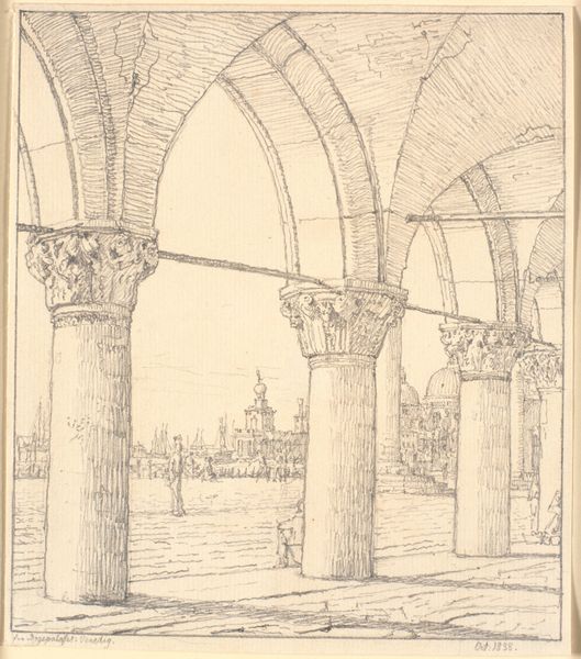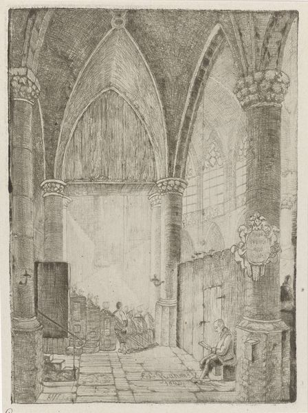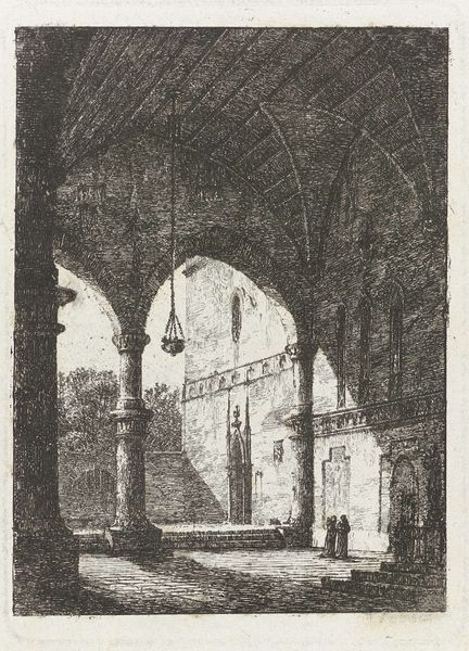 Editor: We're looking at "Roskilde Domkirke. Parti af omgangen," an etching made by Jacob Kornerup in 1851. The texture and perspective give me a slightly dizzying feeling. What do you make of this composition? Curator: I observe the intricate play of lines and light, the careful delineation of form achieved through etching. Consider how Kornerup manipulates linear perspective to construct the interior space, drawing the eye towards a vanishing point just outside our view. Editor: It feels very controlled and precise, almost architectural in its exactness. Curator: Precisely. Note how the geometric forms – the arches, the pillars, the windows – are meticulously rendered. We can interpret this not merely as a depiction of a space but as an exercise in structuring visual information. Does the regular rhythm of the arches convey a certain mood? Editor: A sense of order, maybe even peace, but there’s also a starkness in the lack of figures or detail beyond the architectural elements. Curator: Consider then the deliberate reduction of detail, the emphasis on the underlying structure. One could argue that Kornerup invites us to contemplate the fundamental elements of spatial construction, the bare bones of form. It’s not so much about representing Roskilde Cathedral as exploring geometric order through line and form. Editor: So, the focus is less on the cathedral's specific history and more on how it functions as a set of shapes and lines? That’s a new way to appreciate it. Thanks. Curator: Indeed, recognizing these principles opens doors into seeing abstraction everywhere and anywhere!