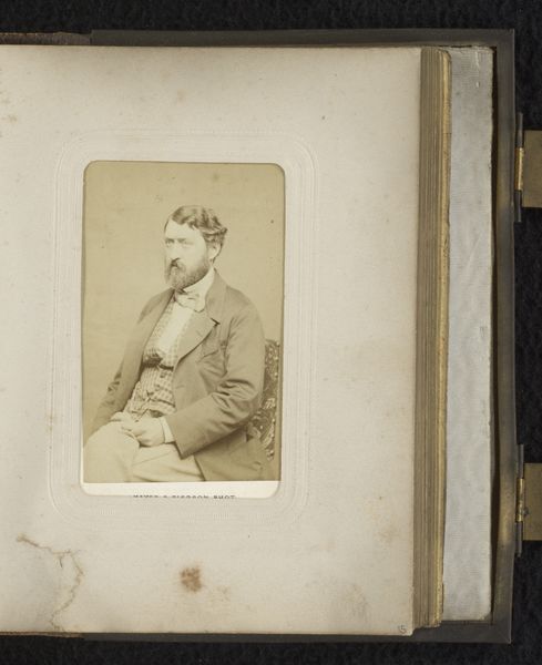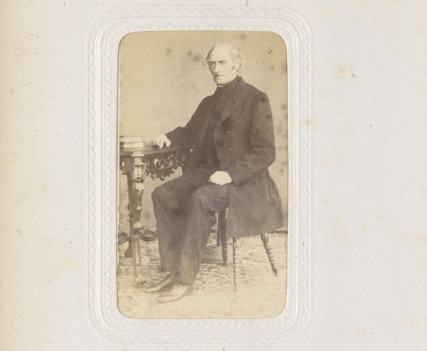 Editor: Here we have a gelatin silver print from between 1860 and 1900 by Léon Rosse, titled "Portret van een zittende man"—Portrait of a seated man. I am struck by how… still everything seems, almost like a wax figure. What do you read in this photographic portrait? Curator: Isn't it remarkable how these early photographs seem to capture something beyond the surface? I see a certain gravity in his gaze, wouldn’t you agree? But also, perhaps, a hint of weariness, or is it wisdom? The way the light falls…it reminds me of Rembrandt, you know, how he illuminated the soul. But let’s consider the context. This would have been quite a formal affair – sitting for a photograph, it's not just an instagram selfie. The clothes, the posture... how does that formality speak to you? Editor: It makes me think about what the sitter wanted to project. Respectability, maybe? It feels very staged. But also there is something very real in his face. It seems like this was his 'Sunday best', he wears it very intentionally. Curator: Exactly! They controlled every part of that scene. It's interesting that we think about "realism", when portraits like these involved so much presentation. Think of that sepia toning... It adds such an atmosphere. What stories might he have? Who did he love? We see the careful attempt at dignity, and in the imperfections, we also can glimpse something much more human. I see both presence, and the slow march of time etched onto that face, don’t you think? It makes one feel grateful. Editor: Definitely. Seeing that stillness really opens up so many questions. This wasn't just about a likeness; it's a whole story waiting to be told. Curator: Yes! It makes the past suddenly feel so very close, doesn't it? And that’s the magic, I think.