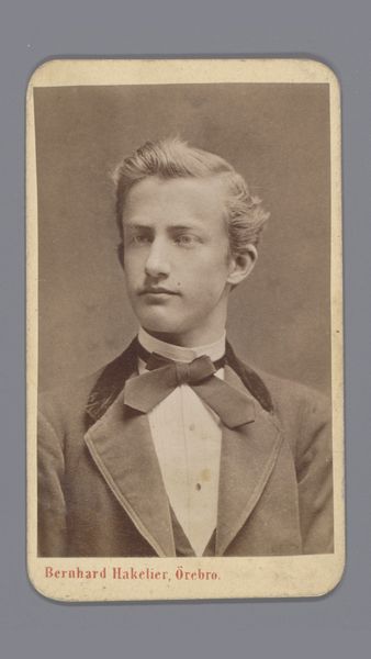Curator: Here we have a photographic portrait, "Portret van een onbekende man," believed to have been captured sometime between 1871 and 1880 by Bernhard Hakelier. Editor: He has kind eyes. I am instantly struck by how very gentle he appears, especially with the soft-focus photographic effect and the creamy monochrome palette. There's something both dignified and vulnerable in his gaze. Curator: Exactly. And consider the socio-political climate of that era. Photography was becoming more accessible, yet portraiture, particularly of men in formal attire, remained a symbol of status and aspiration. His gaze could represent a subtle challenge to established social norms, hinting at burgeoning class mobility. Editor: Perhaps. His soft bow-tie seems to underscore the democratizing forces you mention, pushing against stricter forms. Yet the formal framing, within an oval, feels so consciously traditional and speaks to deeper social entrenchment, doesn't it? The image whispers with all the layered complexities of modernity. Curator: It's true. Also, the use of gelatin silver print as the chosen medium aligns perfectly with photography's emerging role as a powerful tool. This lends credence to considering how identities were being carefully curated and broadcast at this time. What we know for certain is that here is an individual striving towards representation, regardless of social background. Editor: I'm still taken by his almost romantic countenance amidst this academic treatment. He seems to be a type. This unknown man embodies this very brief and beautifully distilled epoch—on the cusp between a sentimental and industrial age. The subtle discolouration of the gelatin lends the work an ethereal aura. Curator: Indeed. The details embedded in the material—that discoloration—and within the man's appearance all tell different stories of the world's evolution at this moment in time. Editor: Exploring this portrait has allowed us to peel away at layers, offering a glimpse of past perceptions—revealing an inherent ambiguity in who and what gets recorded by history.