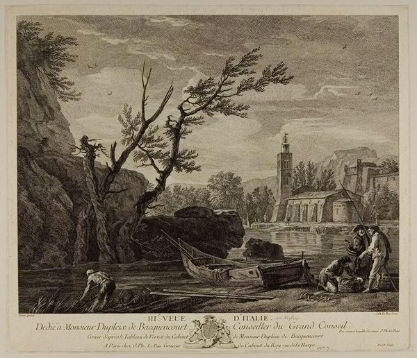 Curator: I find myself drawn into the quietude of Jean Jacques Leveau's "Fishing in Calm Waters." Editor: It has a rather serene feel, doesn't it? The monochrome palette and intricate lines invite stillness. Curator: Absolutely. Leveau, who lived from 1729 to 1786, captures a scene of rural life with meticulous detail, doesn't he? Editor: Indeed. The bridge in the background and the figures along the riverbank adhere to the principles of classical composition, directing the viewer's eye through various planes of depth. The tree is an impressive frame, though. Curator: Yes, that twisted old tree, mirrored in the water, speaks to the resilience of life. And do you notice how the people seem so at peace, connected to the water's gentle flow? It fills me with longing, a whisper of simpler times. Editor: I see your point. Despite its meticulous execution, there is a certain idealization present. Perhaps Leveau aimed to evoke nostalgia by juxtaposing the natural with the architectural. Curator: Maybe so. It's a reminder that art, even in its most formal presentation, can be a pathway to emotional connection and personal reflection. Editor: A fitting synthesis, wouldn't you agree? Leveau's vision—a carefully constructed yet emotionally resonant tableau.
