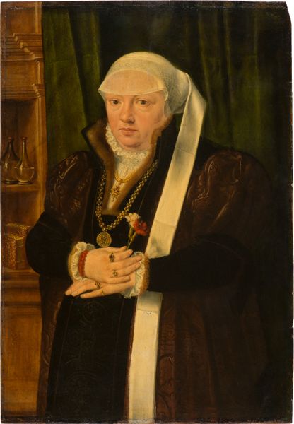 This is an anonymous portrait of Frank van Borselen, made with oil on panel. The painting employs a formal structure typical of its time, yet its composition invites us to consider notions of power and representation. The subject is positioned centrally against a dark background, drawing immediate focus. The stark contrast between the red headdress and the sombre black attire not only highlights his status but also creates a visual tension, destabilizing the conventional solemnity of portraiture. The heraldic symbols in the background function as signs, embedding the painting within a semiotic system of nobility and lineage. However, the somewhat crude execution of these symbols, contrasts with the fine detailing of Frank's face and attire, disrupting any straightforward interpretation of inherited status. Is the artist subtly questioning the value of inherited status versus earned respect? This tension between visual elements invites ongoing interpretation.