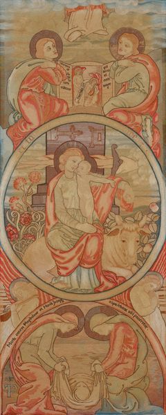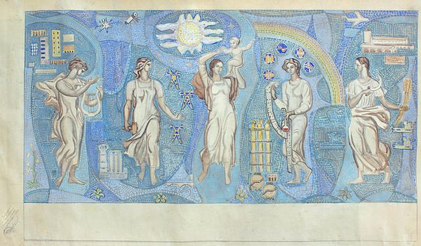 Curator: Joakim Skovgaard’s “Adam Naming the Animals," created between 1871 and 1933, is rendered in watercolor and was initially conceived as a mural. It's part of the collection at the SMK, the National Gallery of Denmark. Editor: It strikes me immediately as almost dreamlike. The soft watercolors give everything a gentle, ethereal quality. The composition, though quite full, feels peaceful, and Adam himself is a study in serenity amidst a potential chaotic menagerie. Curator: Skovgaard was deeply influenced by "The Ancients," a group of Danish artists who advocated a return to simpler, more spiritual themes. The choice of watercolor allows the colors to blend subtly, evoking a sense of harmonious creation in line with Romanticism. What interests me is the depiction of the early relationship between humans and nature, with man placed above it. Editor: And that hierarchy, inherent in the biblical narrative, is what makes me a bit uneasy. Who gave Adam the right to name, and thus, define these creatures? How does this act of naming, of bestowing identity, establish power dynamics we still grapple with today? Curator: Precisely. This image reflects the pervasive cultural narrative wherein humanity is ordained to control the natural world. Considering its location in a public museum, it serves as a constant visual reminder of that hierarchy. Skovgaard clearly leaned towards traditional religious interpretations, evidenced in the somewhat subdued tone and the composition itself. Editor: Yes, but let's push further on Skovgaard's perspective. The choice to depict Adam nude and almost androgynous resists certain readings that celebrate the "masculine dominion" over nature that is associated with a patriarchal order. Maybe there’s something potentially subversive about placing a figure of apparent vulnerability and openness at the top of this hierarchy. How might the audience be expected to identify and relate to him? Curator: It’s a compelling point to acknowledge those potentially conflicting details within the broader context. Ultimately, whether viewers accept, challenge, or critically reimagine conventional, hierarchical interpretations becomes an important and open-ended process in the encounter between the image and its observers. Editor: Indeed. Ultimately, the power of this image lies in its ability to open conversations about how we understand and construct our relationship with the natural world and what these artistic legacies might perpetuate. Curator: A very interesting painting and reflection!