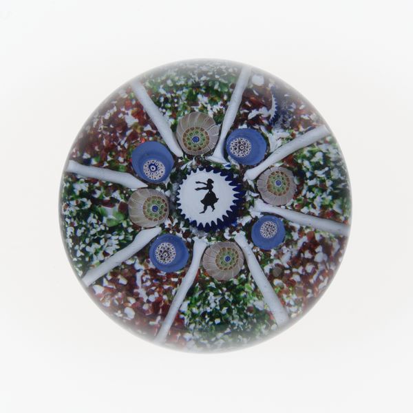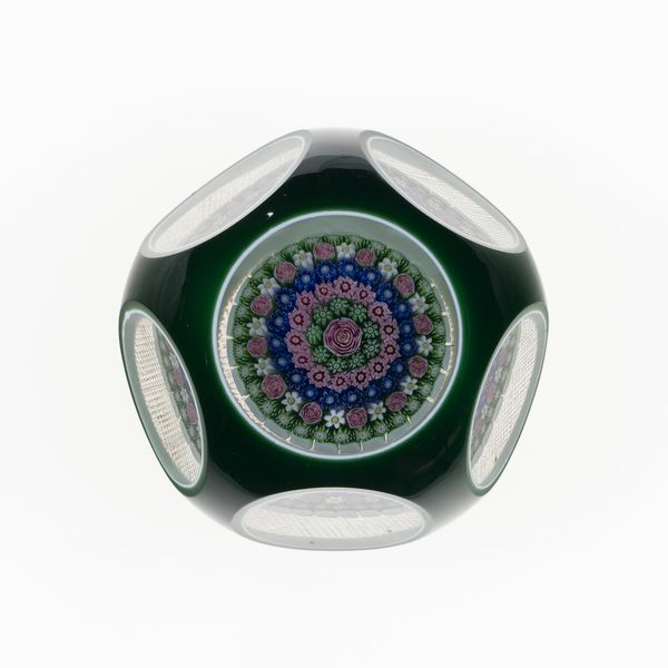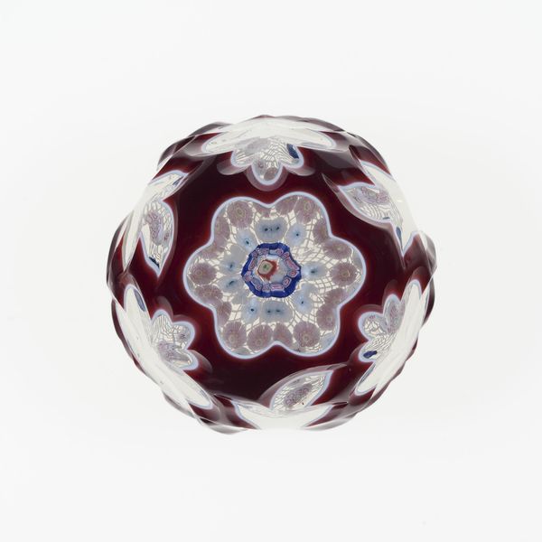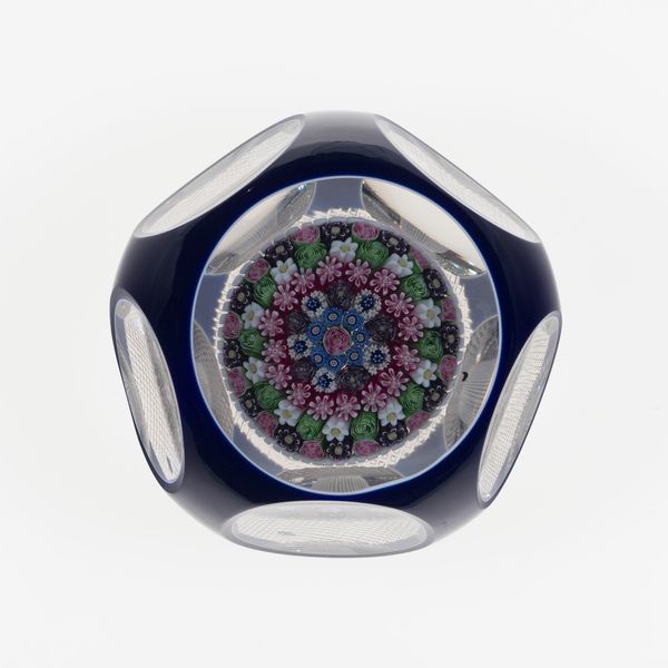 Curator: Here we have a beautiful example of mid-19th century glasswork, a paperweight created by the Baccarat Glassworks around 1845 to 1860. The piece is currently held in the collection of The Art Institute of Chicago. Editor: It looks surprisingly cheerful. It is weighty, but has a miniature cosmos of flowers caught inside, all these light refractions dancing. Curator: Precisely. Observe the intentional placement of millefiori. It creates an intricate floral design, which presents an impressive control of color and form. Consider also the shape of the glass itself, note how its multifaceted dome distorts and amplifies the embedded motif, creating depth and luminosity. Editor: But that apparent sophistication masks the true value embedded in the crafting process and access. Each one made with meticulous techniques: complex molds, and labor that must have demanded specific conditions and skills. Who was it made for, and what are we meant to see through the decorative excess? Curator: What it presents is an intricate pattern that reflects notions of control and order through complex yet deliberate construction. The design leads your eye to the vortex in the center, so we understand the semiotic system employed here—symmetry equates beauty. Editor: Or the illusion of symmetry. Glass production depended then, and still does, on material extraction, energy input, global trade, and on often invisible or marginalized labor. What appears contained within this “perfect” form hides the networks required for it to exist at all. Curator: While I recognize the importance of those considerations, the aesthetic achievement—the interplay of light and color, the spatial organization—ultimately defines its artistic merit. Editor: Perhaps...and for me the enduring value here resides less in the object itself, and more in appreciating what it signifies within our own material realities and connections to its complex network.