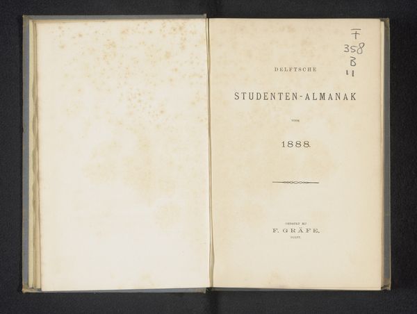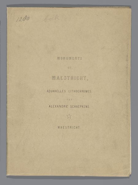 Curator: Here we have an intriguing Art Nouveau print, "Omslag met 12 prenten van de Universiteit van Amsterdam," created in 1902, and designed as a cover by Academische Boekhandel Delsman & Nolthenius. Editor: It's visually arresting! The maroon color immediately gives it a serious tone, offset nicely by that gold lettering in elegant swooping typeface, softened just so with the linear central ornament. The material feels aged; time worn even though the typography remains clean and well preserved. Curator: Yes, it evokes a certain academic weight, doesn’t it? That font certainly speaks to the period—notice how it uses flowing, organic lines characteristic of Art Nouveau, yet still maintains a level of formality appropriate for the subject. This combination lends an aura of sophistication. Editor: Absolutely. And thinking about this as a cover intended to contain twelve prints, its purpose is both functional and symbolic. The material quality becomes particularly interesting; I would speculate that they employed printing methods suitable for long use as its cover design indicates value in its construction. Curator: Indeed. We can interpret the choice of typeface as deliberate signaling; projecting an image of learning and intellectual prestige. This choice subtly enforces a continuity with a historic cultural identity the university claims. The ornament separating the album title and bookstore contact further enforces hierarchy and balance in composition. Editor: Precisely. It bridges utility and art so effectively, that makes you think about access too. Mass-produced, it also democratizes notions around higher learning. A way to signal prestige not only through knowledge but through artful consumption as well, and thus blurring the distinction between everyday and "high art." Curator: A fitting perspective. Reflecting on it all now, I'm left considering how carefully selected graphic design of this era contributed so greatly to the construction and projection of institutional identity, something that really carries meaning still today. Editor: Agreed, seeing how craft production was instrumental in producing works that transcend purely functional objectives gives one hope too. And perhaps why those elements resonate strongly with contemporary eyes as well!