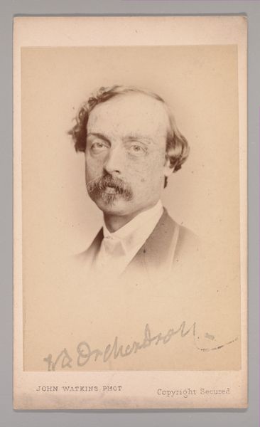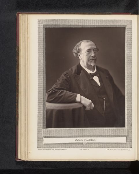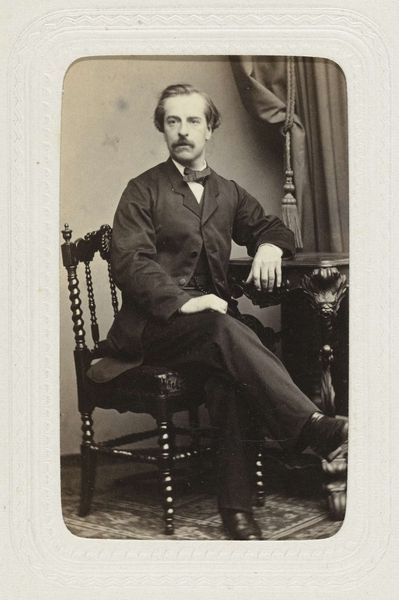 Curator: This is a photographic portrait of Aurélien Scholl, created around 1868. The piece offers a compelling window into the era. Editor: My first thought? Intellectual mischief. He's got that twinkle in his eye, like he knows something you don’t and isn't afraid to use it. Curator: Interesting! Indeed. Aurélien Scholl was a French journalist and writer known for his sharp wit and commentary. This photograph captures not just his likeness but something of his persona. Photographic portraits in the mid-19th century had to negotiate a specific social terrain as they were often commissioned or linked with a particular social status. Editor: Right. And think about the photographic process at the time. It wasn’t instant. So he really had to hold that pose. I wonder what he was thinking, or maybe, what he wanted people to *think* he was thinking! The sepia tones contribute to that sense of staged, thoughtful… defiance, maybe. Curator: The choice of pose and attire – the suit, the bow tie – all speak to the conventions of portraiture designed to convey respectability and seriousness. However, the way Scholl is looking, slightly off-center, conveys an almost subversive intelligence. And I notice he's seated by what appears to be an extensive private library in the background. This surely indicates the sitter’s profession, social milieu, and a conscious positioning within the public imagination. Editor: It does feel like he's putting on a performance. He invites us to decode him. The monacle adds such flair too – slightly eccentric but undeniably confident. A true raconteur, frozen in time but still telling a story. What strikes me is this feels both staged and somehow really intimate, which is an unusual quality for photos from this era. Curator: Absolutely, and through this lens, the photograph serves as a powerful statement about the evolving role of journalism and the rise of the intellectual in shaping public opinion. It's a moment frozen from a time when ideas were gaining new kinds of visibility. Editor: It makes you wonder, doesn't it, about all those untold stories hiding behind the faces in old photos. This one, though, has got me hooked; he dares you to forget him.