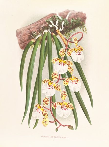 Jean Jules Linden's Aganisia tricolor is an early example of chromolithography, a printmaking process that was as complex as it was beautiful. To create this image, Linden would have used limestone slabs and applied a different color ink to each stone. Paper was then pressed onto the stones to create the final image. The result is extraordinary, as the artist captured the velvety texture of the green leaves and the delicate white and yellow orchid petals. Chromolithography was revolutionary because it allowed for the mass production of detailed, vibrant images. This opened up new avenues for botanical illustration, making it more accessible to a wider audience. Looking closely, we can see how the printmaking process has imbued the image with a unique quality. The layering of colors gives the image a sense of depth and dimension. Linden's work highlights how the means of production are essential to consider if we are to fully understand the cultural significance of an image.