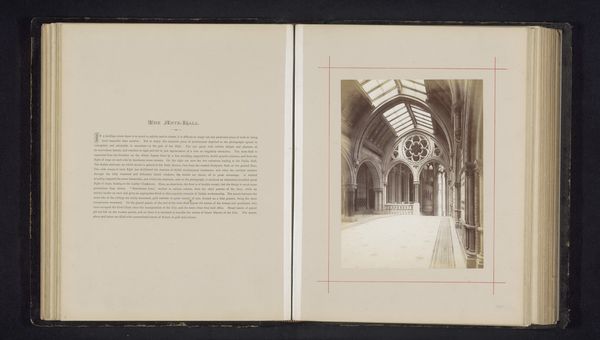 Curator: Here we have a photographic print from 1877 by J. McLeod, entitled "Vestibule in het Stadhuis van Manchester," which translates to "Vestibule in the Manchester City Hall." What's catching your eye? Editor: An oddly quiet grandeur. I almost feel like I'm looking at a stage set. The light, though faint, has a sort of performance to it. I am curious how they lit it for the camera back then. Curator: The photogravure printing process involved etching the image onto a copper plate, inking it, and then transferring it to paper under high pressure. The variations in ink depth create the tonal range we see, richer than a typical photographic print of the era. Editor: Oh, right, like crafting a whole mechanical reproduction by hand almost, not some machine in the way these things often come. Look at how that hand impacts even the feel, something sturdy for this place in town. Curator: Precisely. Think about the labor involved. Each print represents a skilled artisan carefully rendering McLeod's vision. Photography in this era wasn’t simply pointing and shooting; it required considerable craft. Even that aged paper tells part of this story, speaking to how images such as these helped establish notions of the modern urban center. Editor: It strikes me that this painstaking effort has captured more than just the physical space. You can see a palpable sense of importance within it, as if this very labor and attention consecrated what they built here, a true ritual of making space. Curator: Consider too the role of photography itself. The photograph, disseminated as a print, makes the impressive architecture more accessible. It's not just about civic pride, but also about solidifying Manchester’s image as a powerful, modern city for consumption and emulation elsewhere. Editor: This kind of perspective allows it, a moment almost preserved whole. I like to imagine this photograph hanging where others may be—city builders and dwellers from then 'til now who dream dreams here. Curator: I agree, it's about the ongoing influence of such a space as much as the process and material of the photo-making that brought it into existence, still being viewed. Editor: It leaves a quiet question behind... what will they memorialize next, I guess. A hopeful place, I suppose!