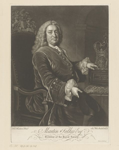 Editor: Here we have James McArdell’s "Portrait of Gerard van Neck," an engraving from sometime between 1745 and 1765. The detail is incredible, and I’m struck by the subject’s very self-assured pose. What story does this portrait tell, in your opinion? Curator: I see here more than just a depiction of an individual. It’s a window into the social structures of the 18th century. How does the opulent clothing speak to notions of power and status, and what narratives might be hidden behind this man's confident gaze? Is it truly confidence or rather a carefully constructed performance meant to legitimise wealth within a burgeoning capitalist society? Editor: That's interesting! I hadn’t considered it as a constructed performance. But now that you mention it, the rigid posture and the lavish attire do seem less natural. Do you think the artist intended to critique these power structures or simply reflect them? Curator: It's a nuanced question. As an artist working within a patronage system, McArdell was likely constrained by the expectations of his patrons. However, even within those constraints, we can analyze the visual language. For instance, consider the sharp contrast between light and shadow and ask: is this purely aesthetic, or does it hint at moral ambiguities inherent in Van Neck's social standing? Editor: So, even seemingly straightforward elements like lighting can be read as commentary? I’ll definitely pay closer attention to those details going forward. Curator: Exactly! And consider, too, how printmaking as a medium democratized portraiture, making images of the elite more accessible. Does this in any way undermine Van Neck’s carefully projected persona of wealth? Editor: I see what you mean! It creates a fascinating tension. I'm beginning to look at this portrait in a completely different way. Thanks for your perspective. Curator: And thank you. It's through these discussions that we reveal how art actively engages with complex questions of identity and social power, rather than merely illustrating them.