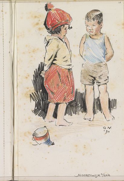Curator: This piece is entitled "Twee rokende figuren", or "Two Smoking Figures," made around 1930 by Otto Verhagen. Editor: Well, it strikes me immediately as something dashed off, capturing a fleeting moment with almost whimsical energy. The colors, especially on the figure on the left, have a playful quality. Curator: I agree; there's a real sense of spontaneity. It’s most likely from a sketchbook, as you can see that the support is toned paper, and it appears to incorporate colored pencil and watercolor. These types of works, in that period, functioned as private explorations that didn't necessarily align with what might have been exhibited publicly. Editor: Right, this piece feels quite intimate. The materials themselves contribute to this sense—watercolor, colored pencil. There’s an immediate accessibility to those materials; there's no need for elaborate equipment or studio setup, pointing to how casually this came together. It blurs any potential boundary between high art and sketching as practice. Curator: Exactly, and in that respect, its presence complicates traditional views of portraiture from that era, when commissioned portraits of societal figures were preferred over simple watercolor explorations of form. I imagine these types of sketches had tremendous significance during moments of heightened global socio-political tension—to have art making as respite. Editor: Yes, and speaking of respite, there's something about the fashion of these figures—a patterned textile for one figure's vest or shawl. The forms suggest movement. We see that in the line, in the medium itself, and there’s a social component, as people create these markers through their visual and material culture. They make identity visible. Curator: Agreed. It really makes you wonder about the figures’ background. The setting, too—the inscription at the bottom reads "Noordwijk zee"—suggests a location near the sea, maybe where society’s elite would vacation and encounter diverse characters. Editor: Right. The accessibility of the materials makes this more egalitarian than formal oil portraiture of the time. Curator: True. It's a fantastic record of the materials and social dimensions of early 20th century culture. Editor: Yes. And that peek into everyday life – almost unremarkable – is the very thing that makes it stand out to me now.