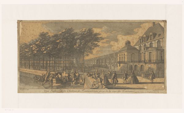 Curator: This etching, titled "View of the Diaconie Old Women's and Men's Home in Amsterdam", is attributed to Jan (I) Smit and dates back to somewhere between 1700 and 1772. What strikes you initially about its aesthetic? Editor: The stark contrast between the almost clinical precision of the buildings and the fluid, somewhat chaotic rendering of the figures on the bridge immediately grabs my attention. The buildings exude a certain institutional order, while life flows more freely. Curator: Precisely. Note how Smit utilizes line to create contrasting textures and depth. The buildings are rendered with tight, parallel lines that establish their formal structure. Then consider how the open expanse of the sky creates atmospheric perspective and offers relief. The billowing clouds contrast with the city's straight lines and architecture. Editor: It's as if the artist consciously separates social structures and personal narratives. Consider that institution for old men and women and reflect on the people represented on the bridge. Those figures seem to reflect on a diverse society with different values of what is commonly understood of care or lack of, and poverty and access within Amsterdam's society. Curator: Absolutely. Consider that printmaking itself during this period had a public function, widely disseminating imagery, cityscapes like this contributed to forming and reinforcing a sense of collective identity. The choice to depict a charitable institution likely reflected a societal emphasis on civic duty and the care of the vulnerable, so it seems to me the people represented could well be passers by or people in charge. The choice to disseminate through printed material had that intended purpose in that society, perhaps with even propaganda involved, perhaps in response to particular circumstances. Editor: The linear details emphasize functionality over beauty in that institution of the painting, with an apparent contrast of class with the apparent everyday individuals populating the bridge... Perhaps Smit invites us to consider the contrasts present in 18th-century Amsterdam. It is all contained within a rigid yet flowing scene. Curator: Indeed, analyzing the print's formal elements deepens our understanding of its socio-historical context. Its linear approach, stark tonal contrasts, and composition reveal not just a cityscape but a complex perspective on social dynamics of the period. Editor: Right. Seeing how the form itself reflects the cultural and historical themes, helps to complete an understanding of the artwork as more than just representation.