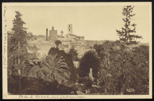 Editor: This photograph, "Untitled (San Francisco from Telegraph Hill)" by William Edward Dassonville, shows a cityscape veiled in mist. It feels almost melancholic. What do you see in this piece? Curator: This image captures a moment of profound change, doesn't it? Consider the historical context. San Francisco was still recovering from the 1906 earthquake. The atmospheric perspective almost obscures the city's rebuilding, hinting at a lingering sense of trauma. What does the framing by the trees suggest to you about viewing this "new" San Francisco? Editor: Maybe a sense of cautious optimism? Like observing from a place of relative safety. Curator: Precisely. And perhaps it subtly critiques the idea of progress itself, reminding us of what was lost. Editor: I never considered how photography could be used to comment on something like that. Curator: Art always reflects the society that creates it, right?