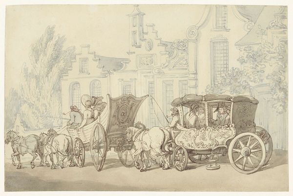 Editor: We're looking at "Optocht in maskerade (plaat 3)," from 1829, by Johannes Paulus Houtman, housed here at the Rijksmuseum. It feels like a playful yet strangely somber parade. The details in this sketch are intriguing – a real old engraving style. What grabs you most about it? Curator: It’s got that wonderful hand-drawn quality, doesn’t it? Like a fleeting thought captured in ink. To me, this drawing breathes. It feels personal, intuitive. I see more than just a record of a parade; I sense the artist's reflection on societal spectacles. Perhaps there's even a wink at the absurdity of it all? The slight distortions, the almost frantic energy – it’s as if the artist is letting us in on a private joke. And the way he uses light, almost like stage lighting. Notice how it highlights the characters. What does it whisper to you? Editor: The sketchbook style makes me think it’s unfinished, perhaps even accidental. But I guess there’s a deliberate choice to leave it loose? Curator: Absolutely! The 'unfinished' quality becomes part of its charm, doesn't it? Think of it like a jazz solo – it's not about perfect notes, it’s about the feeling, the improvisation. That sketchbook art is like letting us see behind the scenes of a more elaborate production. Imagine, how much more intimate and revealing than a grand, formal painting of the same event? Editor: I see that! It's almost voyeuristic, seeing a private view of a public event. I initially saw the sketch as old, but your take has really opened up a new way of appreciating the artist’s approach. Curator: Isn’t it delightful when art surprises us like that? It’s like finding a secret message tucked away in a familiar melody. We think we know the tune, but then… a twist.