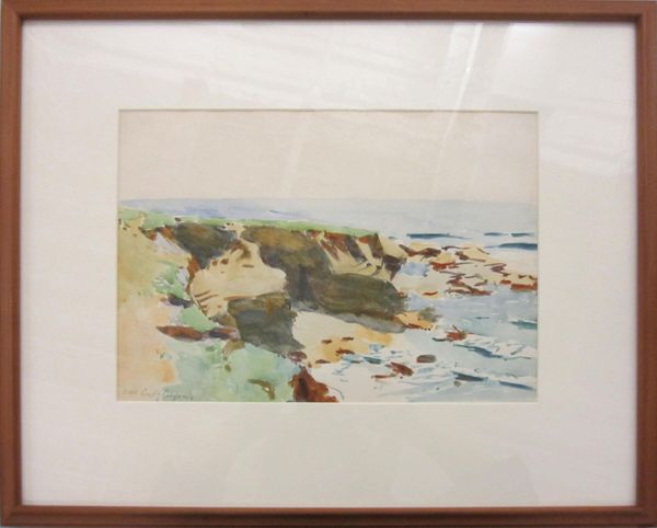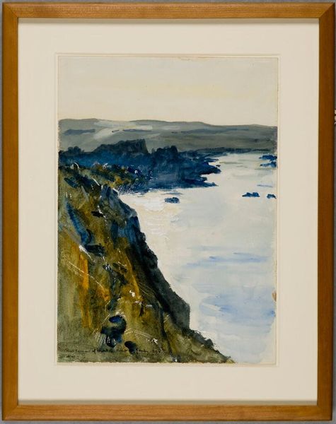 Curator: This is Denman Waldo Ross’s "Highland Light," held at the Harvard Art Museums, a watercolor measuring about 9 by 13 inches. Editor: My first impression is the textured use of color, how the brown of the bluff contrasts with the blue of the ocean, and then that white band of sand. Curator: Ross, known for his theories on color and design, seemed fascinated by landscapes, often using watercolors. What’s interesting is how he uses this medium, traditionally associated with amateur art, to create a scene that's very modern. Editor: The lighthouse itself is almost absent, overshadowed by the natural landscape. It speaks to the growing awareness of environmentalism at the time. How the landscape shapes identity and vice versa. Curator: Indeed, a fascinating example of how artistic expression can intersect with emerging cultural and social ideas, and in an unexpected medium. Editor: A testament to how a seemingly simple landscape can reveal a wealth of historical and material insight.