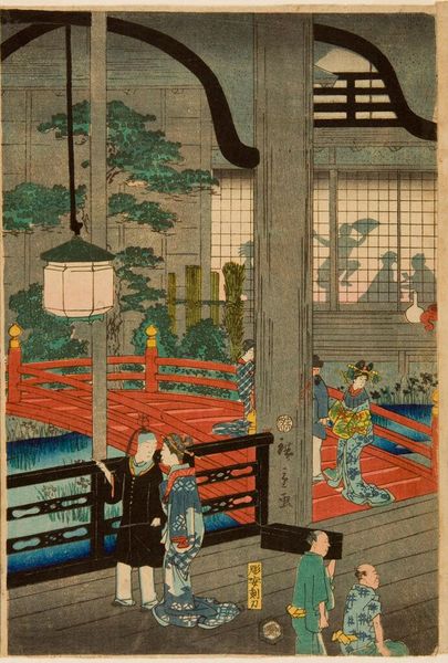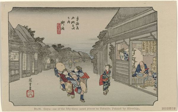 Curator: Utagawa Hiroshige's woodblock print, "Goyu," from the "53 Stations of the Tokaido" series, depicts a scene from the historical road connecting Edo and Kyoto. Editor: Oh, I'm immediately struck by the almost dreamlike quality of the light. It feels like twilight, or maybe just before dawn. There's a stillness, but also this odd sense of implied movement from the figures. Curator: That sense of implied movement is quite deliberate. Hiroshige uses compositional techniques to guide the viewer's eye along the Tokaido road, a significant artery of commerce and culture. The weary travelers convey the physical demands of the journey. Editor: You know, they look more like they're having a laugh than suffering. It feels almost like a stage set, a fleeting moment captured with a wink. There’s something so human about the way they’re propping each other up. Curator: Indeed, that everyday realism is characteristic. The "Goyu" station, as represented here, was notorious for unscrupulous women and unwelcome advances toward travelers. Editor: Well, now the composition makes more sense, there's a cheeky mischievousness to the way those figures are leaning on each other, laughing. It's good to know the context behind all that seemingly random movement in the painting. Curator: Exactly. Symbols embedded in the artwork like this show cultural memory and continuity through visual expression. Editor: Ultimately, a very memorable image of a moment filled with fatigue and humor, all in one snapshot.