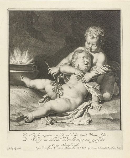 Curator: This engraving at the Rijksmuseum is entitled "Two Playing Children: Spring and Autumn" by Hendrik Bary, likely completed between 1659 and 1677. The detail achieved within this medium is quite remarkable, isn’t it? Editor: It is, though initially, the plump figures set against that dark background give it a somewhat unsettling feel. It almost veers into caricature, doesn’t it? Yet, the tonal range in the drapery is striking. Curator: Yes, I see your point regarding the initial impression, but I am intrigued by the Baroque embrace of symbolism here. The child adorned with a floral crown clearly represents spring, while the other holds ears of wheat. Consider how Bary has used line and form to delineate not just the physical characteristics but also abstract concepts of time and seasons. Editor: And notice how Bary links these seasons. It's a very idealized, almost utopian vision of childhood linked directly to the fertility and abundance of the land. What sort of context could have spurred such a benevolent image? The engraving’s inherent multiplicity—its purpose for wider circulation—signals this ideal wasn’t niche. Curator: The figures exhibit a dynamic contrast in texture – the smooth, almost porcelain skin of the children against the detailed folds and fabric of their covering. The texture created in this medium allows the viewer to feel they can almost grasp what is occurring in this piece. Also, Bary expertly models their forms using subtle gradations of light and shadow, adhering to the chiaroscuro aesthetic. Editor: From a purely historical perspective, pieces such as these became tools of social communication, solidifying seasonal traditions through accessible imagery. Their idealized portrayal offered a comforting view amid socio-economic conditions often defined by agricultural dependence and seasonal uncertainty. This is much more than artistic exercise; this piece demonstrates a desire for harmony and balance in life. Curator: An interesting interpretation! The contrasting of smooth and rough texture alongside dramatic contrast in shading definitely allows this message to be perceived. I will certainly reconsider my view of this artwork after hearing your remarks. Editor: And I am certainly impressed with how Bary can imbue even an engraving with a dynamism. It brings an otherwise static medium to life with playful thematic engagement.