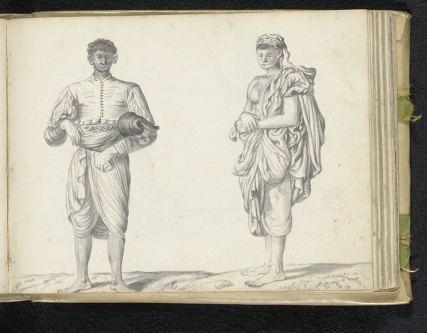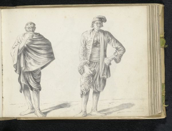 Esaias Boursse sketched 'Man smoking a pipe in the company of two other labourers' using graphite, rendering three figures with a tangible, sculptural presence through subtle gradations of light and shadow. The composition's strength resides in its rhythmic distribution of forms, from the leftmost figure's structured attire to the central smoker's fluid drapery, culminating in the poised stance of the figure on the right. Boursse masterfully orchestrates line and form to evoke depth and volume, transforming the two-dimensional surface into a stage for human presence. The artist's meticulous approach to light exposes the underlying geometry of the figures, thereby creating an interplay between the seen and unseen, the manifest and latent. This sketch transcends mere representation; it is an exploration of form that underscores Boursse’s engagement with the structural possibilities of drawing.