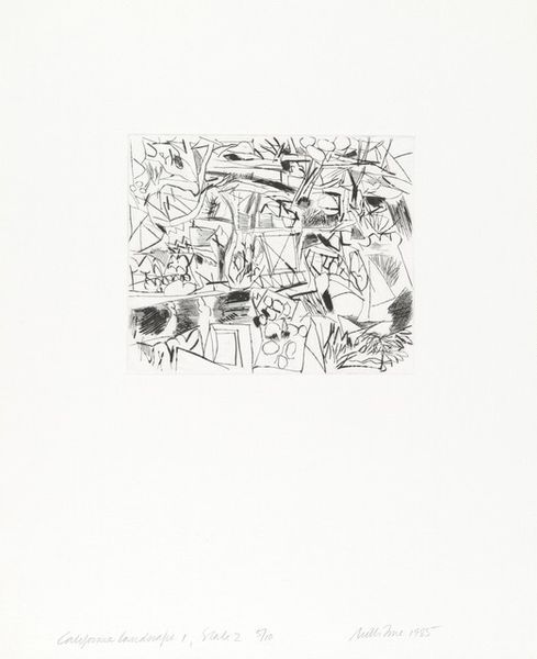 Curator: Let's take a look at this intriguing "Untitled" print from 1973 by Wilford Wayne Kimball Jr. What are your initial thoughts? Editor: Hmm, it’s like a delicate whisper. An echo of forms barely contained within that oval. A bit ghostly, almost. It reminds me of gazing at tangled twigs through fogged glass. Curator: It's fascinating how Kimball combined the clean geometry of that encompassing oval with what appears to be quite organic and perhaps improvised linework inside. Considering that this is a print, let's think about process here. Editor: Exactly, the interplay of control and chance intrigues me. It has a handmade feel but in that repetitive mark making—there's precision there in transferring that design, I am quite intrigued! What story do those marks wish to convey? Curator: This piece highlights Kimball's exploration of abstraction and printmaking techniques. Given the era, it resonates with post-war material explorations by artists like Eva Hesse, for example. We are drawn to explore both intentionality and happenstance by revealing production, not concealing. Editor: It speaks volumes of how constraints are sometimes very freeing, like having a set frame allowed him, if it did indeed provide a space to explore what lies just beyond boundaries and make way for possibilities. Curator: We see similar exploration through repetition in work of sculptors such as Donald Judd where an entire practice focused on a repetitive system and process revealed unique characteristics when observed together as a set. Here too we see an entire practice distilled down into this piece. The result being that we question art vs craft! Editor: I find myself wanting to touch the surface, to feel the paper. The textures, to decipher the depth created by that pale almost ghostly linework. Does each of those tiny threads, as simple as they seem, lead somewhere, tell a story? Maybe to lost or reimagined worlds? Or the interior of our inner self? It's captivating how such restraint inspires contemplation. Curator: Thinking about materials and Kimball's choice of printmaking really informs my reading. It connects this individual piece to broader discourses about value and artistic labor. What starts with production, then becomes distribution! Editor: Indeed! And that invites another form of viewership and production as now a new conversation begins with the viewers—one where we consider place, identity, and what is indeed meaningful. Curator: Beautifully said. It makes you wonder about the artist's intentions during a transformative period for printmaking and art generally. Editor: Definitely leaves one pondering, long after walking away. A ghost in the machine—beautiful and haunting, simultaneously.