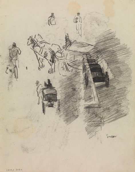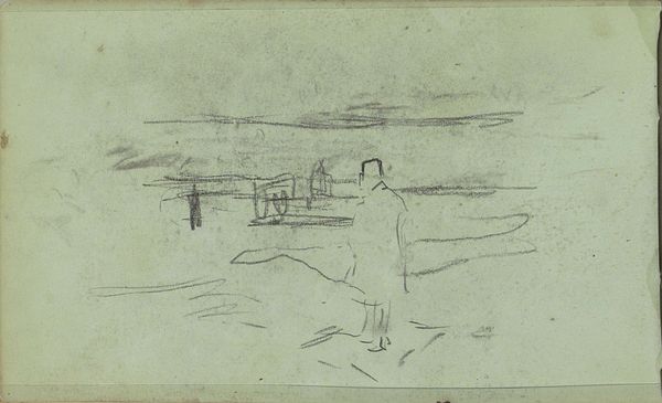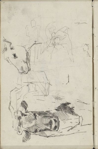 Editor: This is a drawing by George Hendrik Breitner called "Schets van een landweg met een boer en koeienkoppen", which translates to "Sketch of a country road with a farmer and cow heads". It was made sometime between 1867 and 1923. It's a fairly light pencil work on paper. What catches my eye is its intimate and casual quality – like a page torn from an artist’s personal sketchbook. How do you interpret this sketch? Curator: For me, the seemingly simple sketch carries echoes of agrarian life and its symbolic weight in Dutch culture. These cow heads, isolated, almost become emblems of fertility and prosperity – archetypes. The lone farmer on the road, framed by the receding perspective, appears as a custodian of this heritage. Do you feel a sense of nostalgia embedded within these images, or is it something else? Editor: I see the nostalgia, now that you mention it. It makes me think of simpler times and the importance of farming. But the sketchiness also gives it a modern, almost fleeting feeling. Curator: Exactly. It is not a photograph of a real thing. Breitner isn't just depicting a scene; he's capturing a feeling, a mood connected to our cultural memory of the countryside. This work reminds me how symbols aren’t fixed; their meanings shift with time and individual experience, much like memories themselves. I think his signature grounds this work and gives it additional weight. Editor: That’s a great point about symbols shifting. I didn't think about the cow heads as being more than just… cows. Thanks for pointing out how personal memory gets tangled with cultural symbols, especially for art created for future consumption. Curator: It makes one ponder about other familiar images which once stood for something far greater in times gone by, yet, linger to have new meanings for us.