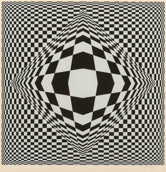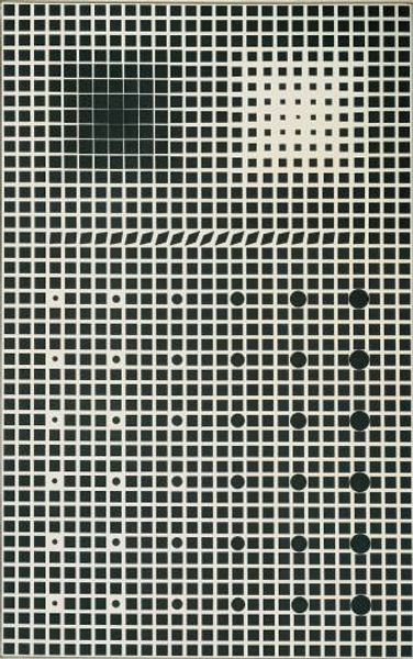 This is "Fission," an optical painting by Bridget Riley, now residing at MoMA, and it’s pure visual energy. Riley’s not just putting dots on a surface; she's orchestrating a visual experience. Look at how the dots shrink and squeeze towards the center. It's like the whole thing is breathing, expanding and contracting before your eyes. There's a real physicality to this piece. You can almost feel the surface moving, like you’re standing on unstable ground, because of the way the contrast between black and white plays with your perception. It’s a testament to how simple forms, repeated and tweaked, can create such dynamic, almost dizzying effects. I'm reminded of Victor Vasarely's geometric abstractions. But where he was interested in creating illusions of depth, Riley is much more concerned with the sensation of seeing itself, and the process of perception. Art is about ambiguity, baby! Enjoy the ride.
