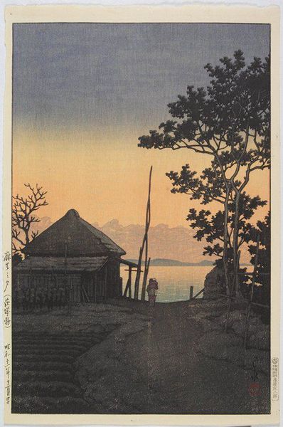 Hasui Kawase's woodblock print, "Self-Portrait at Kiyomizu Temple, Kyoto," invites us into a tranquil, moonlit world. The layering of blues, from the deep indigo sky to the subtly textured wooden planks, evokes a sense of calm and introspection, almost like a visual poem. I love how the artist captures the scene. You can feel the cool night air and the stillness of the temple grounds. The solitary figure, presumably Kawase himself, is rendered with soft outlines which blend into the background. Look closely at the shadows cast by the railing; they create a rhythmic pattern, mirroring the structure of the temple itself. It’s this kind of close attention to detail, alongside the masterful use of color, that sets this print apart. Kawase's contemporary was Hiroshi Yoshida who, like Kawase, was a leading figure in the Shin-Hanga movement. Both artists shared a commitment to depicting landscapes with a modern sensibility, yet their approaches differed. Where Yoshida often favored dramatic compositions and bold colors, Kawase's work is characterized by a quiet lyricism and subtle tonalities. Both artists embraced the beauty of imperfection and the ever-changing nature of the world around them.
