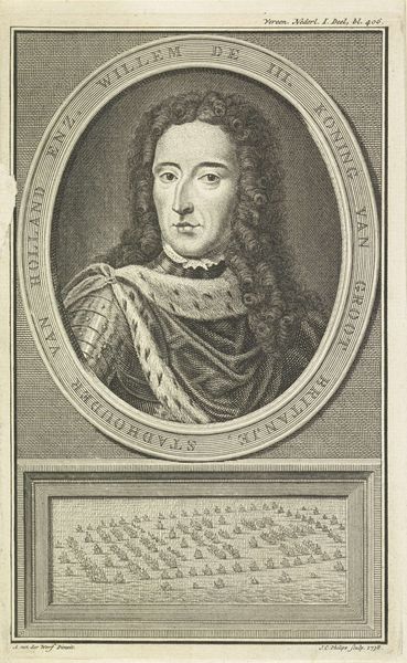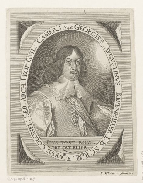 Curator: Here we have an engraving from 1671 by Joannes van de Berg. It's entitled "Portret van Albert Sigismund van Beieren, prinsbisschop van Regensburg," or "Portrait of Albert Sigismund of Bavaria, Prince-Bishop of Regensburg." My first impression is how precisely rendered every detail seems, especially within the ornamentation. Editor: Indeed. Look at the way the artist utilizes the engraving technique to bring texture and life to the robes of Albert Sigismund. There's real attention here not just to representation but to the materiality of power. This connects with how ecclesiastical garments are crafted and utilized. Curator: Absolutely, and understanding Albert Sigismund's context is crucial here. He was a significant political figure, embodying the complex intersection of religious and secular authority within the Holy Roman Empire. The portrait, then, isn't just about individual likeness, but the social and political power structure of which he was a part. He belonged to the Wittelsbach dynasty which controlled a significant portion of Bavaria for many centuries. Editor: Exactly! Notice the dedication along the oval’s outer rim. It reads from "Albertus Sigismundus," enumerating his territories from Bavaria, through Friesing, to Regensburg. These weren't simply titles, they were very much produced through physical territories with real-world resource control. Engravings, by nature, make the powerful reproducible, which itself reinforces this established order. The labor and production methods, the control of printed knowledge… Curator: The floral embellishments within the border contrast beautifully with the sharp lettering and convey an image of both luxury and cultivation. This was important, not just for someone in his position, but generally across art patronage at the time. Art served as a visible language of diplomacy, alliance building, and familial influence. The symbolic richness reinforces status through displaying family heraldry and allusions to virtues and moral concepts that reinforce Albert Sigismund’s suitability to leadership roles. Editor: And speaking of emblems, the cross, the coat-of-arms… Each is carefully placed, methodically produced, designed to send messages about ownership, legacy, and lineage through reproducible, affordable means. Van de Berg as an engraver, is himself deeply embedded in these systems of power by simply enacting them in reproducible print form. The artist becomes complicit, so to speak, but there lies the value. Curator: So, through both style and function, the work illuminates the cultural politics of its era, linking individual portraiture with a vast network of political power, material expression, and social significance. Editor: This portrait helps us realize that art isn’t made in a vacuum. Materials, modes of production, context... all reveal the broader forces shaping art and, more importantly, those the art shapes.