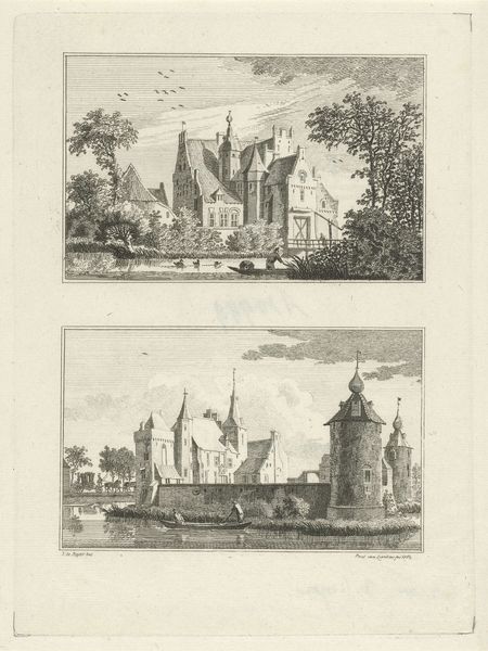 Editor: So, this print is called "Kapel in Loo en het Huis Loowaerd" by Paulus van Liender, made in 1762. It's a Dutch Golden Age engraving with two separate landscapes stacked on top of each other. The fine detail almost gives it a photorealistic quality. I'm struck by the depiction of everyday rural life, but in such a composed and deliberate manner. What stands out to you most when you look at this piece? Curator: It whispers stories to me, you know? Of a world caught between the divine and the daily grind. Look closely at the upper panel, the chapel isn't just a building; it's a hub. See the figures congregating, almost as if faith and community are breathing the same air. What do you think is so special about this scene? Editor: The contrast between the serene religious space and the bustling domesticity does create this sense of life. The lower image feels similarly populated, maybe this speaks to a vibrant community. The scenes have lots of common life themes for the period. Curator: Precisely! Liender does capture it all. I see a blend of tradition and innovation, you know? The piece echoes a simpler life but demonstrates remarkable technical skill for its time, a blend that defines so much of Dutch art. Is it nostalgia or reality that's being engraved here, I wonder? Editor: That's a fascinating way to look at it; there’s a level of detail that suggests keen observation of real life. Perhaps it is real, even while idealized at the same time. It certainly offers a peek into a very particular past. Curator: Exactly. A past lovingly etched into existence, offering us a space to contemplate faith, nature, and our place in it all. I'm starting to think of this piece now in relation to our human need for documentation of even simple settings. Thanks for taking the time to view it with me today.