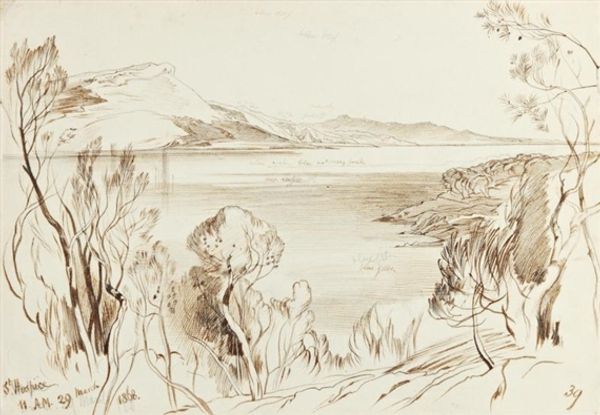 Curator: This is Benjamin Champney's "Men Fishing, Lake Molly Chunk-a-Muuk, Maine," held in the Harvard Art Museums. The dimensions are intimate, roughly 14.5 by 21.5 centimeters. Editor: It's all in graphite, lending a quiet, almost wistful mood. The mountains in the distance create a stark contrast with the human figures in the foreground. Curator: The artist uses the simple linear perspective to draw the eye toward the horizon, making the viewer feel as though they could step into the drawing. Editor: I'm intrigued by the process; the deliberate marks, the pressure applied to the graphite, and how that informs the quiet labor of fishing, that meditative activity. Curator: Certainly, the economy of line speaks to a specific formal language, one where the unsaid, the negative space, becomes as important as the rendered detail. Editor: It makes me think about the availability of materials; graphite became more accessible. I wonder about Champney's relationship to the means of production, and how that impacted his vision. Curator: These are fascinating points to consider when viewing this work. Editor: Indeed. This sketch makes you contemplate the intersection of human intention and material agency.