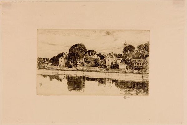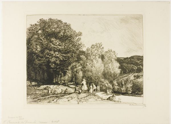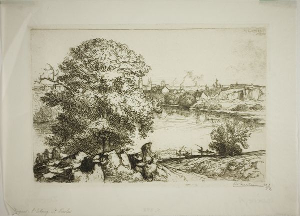 Curator: This etching, titled "Poissy", was created by Auguste-Louis Lepère in 1908. I’m struck by how he captured such a complete scene using only the fine lines of the etching process. What catches your eye first? Editor: Well, immediately I'm drawn to the almost dreamlike, nostalgic feel it has. The details are soft, like a half-remembered memory of a summer day. Curator: That resonates with the broader artistic currents of the period. It’s French Impressionism rendered in print. Look at how Lepère plays with light and shadow, not in blocks of color, but through a dense network of lines, creating texture and atmosphere. Notice the figures on the shore – they almost blend into the trees. Editor: Exactly! It feels very human and lived-in. The composition subtly guides the viewer. We have these strong vertical lines of the trees leading us toward the bridge and the open expanse of the river beyond, representing civilization's integration with nature. Curator: The bridge itself could be a symbol of connection and progress, yet it's framed by the more organic, less structured trees. There’s almost a dialogue there, an awareness of industrial progress encroaching upon the natural world. And this work, being a print, means it's accessible, portable, replicable... It spreads this imagery, this ideal. Editor: Yes, and etching is also inherently about layers, about building up meaning. We see that here in the image's narrative complexity—not just a pretty landscape but a tableau of daily life unfolding with figures working, resting. It portrays modern social realities. How would the citizens of Poissy perceive this image? It captures a sort of ordinary serenity that would probably appeal across class lines. Curator: Perhaps, though prints often found their primary audiences among the bourgeois, who collected them and reinforced a certain cultural capital by doing so. The print becomes a token, not just of aesthetic appreciation, but of cultural awareness and refinement. Still, your point stands. Editor: Ultimately, its strength lies in Lepère’s masterful technique and his eye for the quiet rhythms of ordinary life along the river, which transcends social classes. Curator: Indeed, it speaks volumes about its time and its culture through its very texture and choice of subject, offering a gentle yet profound insight into France at the beginning of the 20th century.