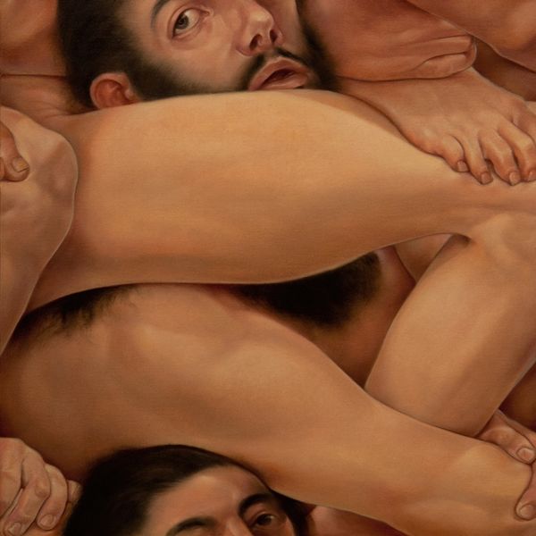 Curator: Welcome. We are standing before Lanise Howard’s, "Age of Aquarius", crafted in 2020, using oil paint. What’s your initial impression? Editor: It's striking—a somewhat melancholic pyramid of figures. The cool, muted tones and reflective surface below evoke a sense of gravity, perhaps even a dream-like state. The composition draws your eye upwards. Curator: The pyramid arrangement of bodies is central to understanding Howard’s symbolic framework. The figures, intertwined and vulnerable, appear to represent humanity. She might be commenting on collective reliance and shared experiences as part of the human condition. Editor: Visually, I am captured by how the light and shadow play across the bodies, accentuating their form and musculature. It gives a sculptural quality despite being achieved on a flat surface. How each limb is interwoven feels quite deliberate, almost choreographic. Curator: Indeed. This choice of representation directly challenges established norms within art historical conventions. The variety of skin tones points towards the erasure of communities of color within symbolic portrayals of humanity and society in classic paintings and sculpture. Editor: Looking again at the surface underneath them – that highly polished, reflecting surface below. It acts like a distorted mirror. I wonder, could that water motif signify subconscious thoughts and the necessity of confronting buried issues? Curator: It very well could. Howard’s oeuvre actively questions our awareness surrounding oppressive apparatuses. By merging elements of myth, figuration, and pointed symbolism, the artist generates narratives concerned with power and agency. Editor: Considering the "Age of Aquarius" title, I note how the golden light source emanates from above like a halo, further elevating that visual hierarchy of bodies while seemingly imbuing hope into the lower darkness and muted hues below the figures. Curator: And that symbolic element further connects to themes of spiritual awakening as they’re represented among contemporary discourses surrounding issues related to liberation. She utilizes a Western iconographic form with roots from Renaissance painting to address modern subjects related to race, identity, and freedom. Editor: This artwork rewards careful observation. Thank you for shining a light on it. Curator: My pleasure. Thank you for engaging with "Age of Aquarius" and, by extension, initiating a dialogue around its deeper social and historical echoes.