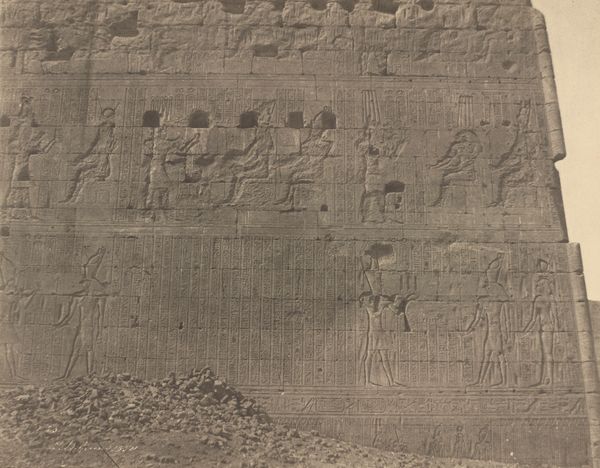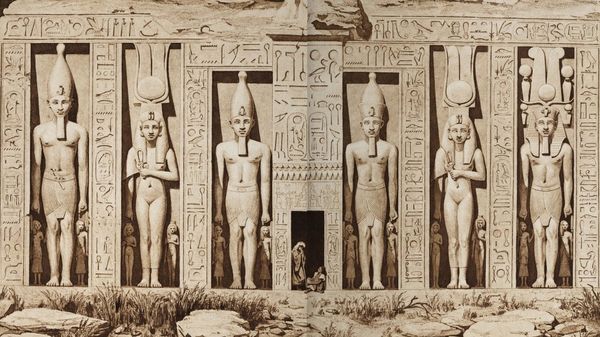 Editor: This is Joseph Smith's "Abu Simbel," currently at the Harvard Art Museums. The ochre hues create a really interesting sense of place and monumentality. How do you read the composition? Curator: Note the emphasis on the interplay of light and shadow, creating a textural, almost tactile quality. The artist’s focus on form and structure invites contemplation on the very essence of representation. What is the artist trying to convey through these formal elements? Editor: I see that the artist has used color and form to create depth, but the actual meaning is still a mystery to me. Curator: Perhaps that ambiguity is the point. The artwork serves as a space for individual interpretation, guided by its intrinsic visual qualities. It's been illuminating to examine this work with you. Editor: Absolutely, thank you for shedding light on the formal qualities!