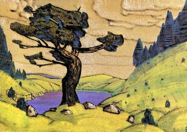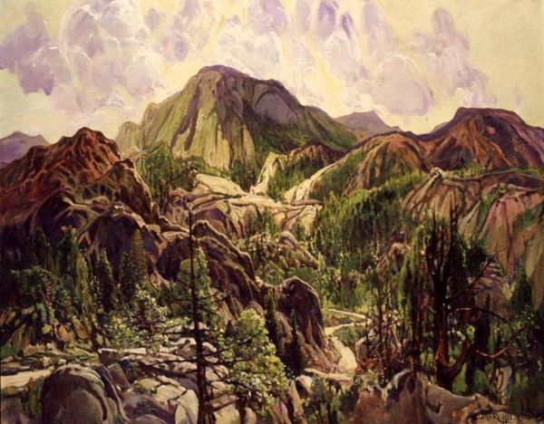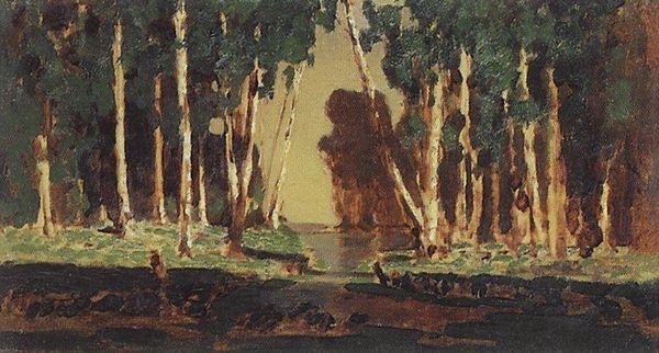 Editor: Here we have Nicholas Roerich's 1912 oil painting, *Ravine*. The bold use of colour to render the forest really strikes me, and there is a slightly melancholic atmosphere about it. What do you see in this piece? Curator: I see a landscape wrestling with cultural and spiritual anxieties of the early 20th century. Roerich, deeply influenced by symbolism and the Russian avant-garde, presents a world that’s seemingly idyllic but vibrates with underlying tensions. The ravine itself – is it a metaphor for social division, perhaps, or the chasm between humanity and nature? Editor: That's interesting. I was mostly focused on the aesthetics. The boulder in the foreground seems to dominate everything, though. Curator: Exactly. Consider how the boulder acts as a barrier. It blocks our direct view, forcing us to contemplate what lies beyond, in the depths of the ravine, and consider the obstacles–both literal and metaphorical–in our own lives. Is Roerich inviting us to reflect on the societal impediments of his era or perhaps more generally to analyse access to natural resources and consider how class and social position create a ravine? How do you perceive the overall impact now, considering the period's turbulent sociopolitical landscape? Editor: Thinking about it that way, the painting feels less like a simple landscape and more like a statement about being blocked from progress or understanding. The detail almost feels too curated and perfect in a way. Curator: Precisely! Roerich's *Ravine* encapsulates how landscape art can be so much more than just a pretty picture; it's a space to interrogate power dynamics and reflect on collective identity. Editor: I'll never look at another landscape painting the same way again. I appreciate how you’ve helped me think about art's function within wider historical and social forces. Curator: And I admire your insightful observations; they’re a great reminder of art’s ability to generate conversations and invite engagement with ideas that touch upon contemporary culture.
