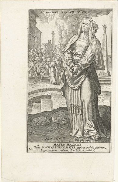 Editor: This is Johann Sadeler's "Heilige Juliana", dating back to between 1583 and 1587. It’s an engraving, a type of print, currently held at the Rijksmuseum. It definitely has this sort of dramatic, almost theatrical flair… What really jumps out to me is the figure standing triumphant over the dragon – what do you see in it? Curator: It reminds me of a well-staged opera, really. The virtue triumphant over evil – a real classic of the Mannerist style. See how her pose, the way the light catches her robes, even the exaggerated expressions of the vanquished figures beneath her – it's all about creating a powerful emotional experience for the viewer, right? She's utterly composed. Editor: Definitely theatrical! The composition almost feels a little… crowded? Is there a story there or some context I'm missing? Curator: Absolutely! It's Saint Juliana, of course. The sword is her primary attribute as is stepping over the dragon – she refused to marry a pagan senator, faced torture, and ultimately overcame a devil disguised as an angel. Johann has distilled it into this… operatic moment. Editor: Wow, the devil in disguise! So it’s like, one-stop shopping for symbolism, huh? Curator: Precisely! See how he positions that little broken sword down at the bottom? You can sense his inner joy just burst through the symbolism; it's just wonderfully absurd and incredibly pious, somehow. What is it about all that makes you laugh? Editor: The level of dramatic flourish! All this detail packed into such a small print feels like it's overflowing with meaning! I’m seeing the printmaking in a new light after our talk. Thanks so much. Curator: Absolutely, I now better get the emotional resonance. Until next time.