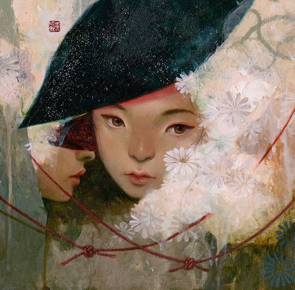 Editor: This is Soey Milk’s “Kind,” an oil painting from 2018. The woman's gaze is captivating. I'm drawn in by the mix of realism in her face and the more dreamlike, abstract quality of the background. What do you see in this piece? Curator: I notice the visual language playing with duality. There’s the overt, tender depiction of the young woman, and then there’s the symbolic vocabulary enriching it. Look at the flowers. In art, they've long represented fleeting beauty and mortality. The contrast between the fresh, blooming flowers and the rather somber, almost gothic, backdrop creates a tension. How does this tension affect your understanding of “kindness” as represented in the portrait? Editor: It makes me think kindness isn’t just simple gentleness. The shadowy background hints at challenges or sadness. The kindness the subject exudes feels stronger, like it exists despite hardship. Curator: Precisely. The presence of what appears to be a bird, tucked away in the shadows near her shoulder, also speaks volumes. Birds, across many cultures, symbolize freedom, but also vulnerability. The figure seems to offer protection, subtly linking kindness to empathy and protection. It suggests a quiet strength in the face of potential fragility, both internal and external. Editor: That's interesting, I didn't notice the bird at first glance. It is like she’s shielding it. The blend of these gentle and darker elements creates a much richer narrative than a straightforward portrait. Curator: Indeed. The artist utilizes symbolic weight to elevate the visual narrative, encouraging viewers to contemplate the depths and complexities inherent within a single, seemingly simple virtue. It leaves us considering how images can speak volumes without uttering a single word. Editor: I appreciate learning about the flower and bird imagery. I see the painting in a completely different way now.