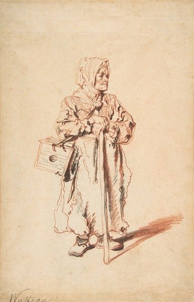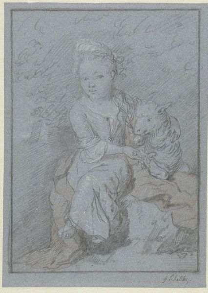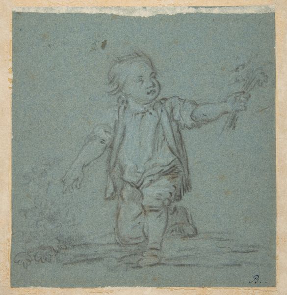 Curator: Isn't it wonderful? This is Anton Mauve's "Standing Boy with a Hoop," likely made somewhere between 1848 and 1888. It’s currently held at the Rijksmuseum. Editor: It has this beautifully melancholic air. Like a memory, a child's solitude perfectly caught with simple, vulnerable lines. Curator: Indeed. Mauve has this incredible way of conveying movement and life through very simple means, just the pencil on paper and some colour pencil. Editor: Talking of process, I am thinking a lot about the boy’s attire. It is the mid 19th century and his coarse woolen clothes speak volumes about a child's work. Were these drawings often commissions? Was this just a quick sketch in preparation for something else? I'd love to know more about the social context of this sketch! Curator: Good questions. Mauve was known for genre paintings, often depicting scenes from everyday life in the countryside. It could've been a preparatory sketch for a larger painting, capturing the fleeting moment of a child at play but also the mood of a time in profound socio-economical transformation. Editor: It makes me consider the material production of childhood, what his clothes meant to the labour, what the wooden hoop may have represented for recreation. Are the pencil lines themselves mimicking a sense of turning, circling in motion? Curator: Perhaps. Art historians categorize Mauve within the Hague School and also impressionism movement. He beautifully depicts that era. Editor: What strikes me is how powerfully the pencil – that humble, mass-produced object – is wielded to render such intimacy. Curator: It certainly makes you ponder how art transcends its medium. Editor: It does indeed, it's a poignant snapshot into a young boy's world. Curator: Agreed. A simple drawing that invites complex contemplations.