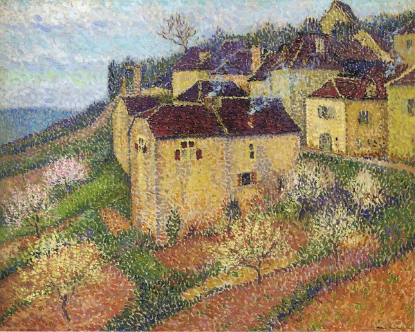 Curator: Camille Pissarro’s “Les Mathurins, Pontoise,” painted in 1877, presents a scene in the French countryside rendered with the distinct touch of Impressionism. Editor: My first thought is how soft and dreamy this piece feels. The light, the blurred edges...it almost dissolves before my eyes. There's a tangible weight to the land in the lower right corner. Curator: Indeed. Pissarro was deeply committed to capturing the fleeting effects of light and atmosphere. We see that in his broken brushstrokes, the layering of color to depict the sky, and of course his choice to paint en plein air. This method became critical, moving painting from the studio to the source. Editor: And speaking of that source, the location is everything. Pontoise, a working-class area outside Paris—not exactly the typical picturesque view celebrated at the Salon. It's refreshing to see this dedication to representing the actual place of work for so many at the time, immortalizing a scene with all the mud and imperfection involved in manual labor and urban sprawl. Curator: The composition too is subtly complex. The buildings in the center, the suggestion of a village or cityscape, are framed by natural elements. He deliberately balances the constructed world with the organic. Look at how he juxtaposes that roughly worked hillside, teeming with heavy materiality, with the delicate hues that define the architecture. Editor: Yes, that deliberate positioning emphasizes a social reality – a tension between the built environment, its resource extraction and the daily lives lived. It’s fascinating how Pissarro manages to communicate so much with such light brushwork and dedication to form and observation. I keep wondering how many farmhouses had to be torn down for that church! Curator: A fair assessment. It allows us to think of Impressionism as more than just surface appearances but as an aesthetic project deeply implicated in social commentary. Editor: Exactly! And Pissarro, by grounding himself in that material reality, challenges notions of what is ‘worth’ painting. Curator: It certainly lends the work greater intellectual heft, enriching the aesthetic experience with questions regarding artistic labor and context. Editor: Right. Next time I’ll come visit ready to work in these fields. Thanks.