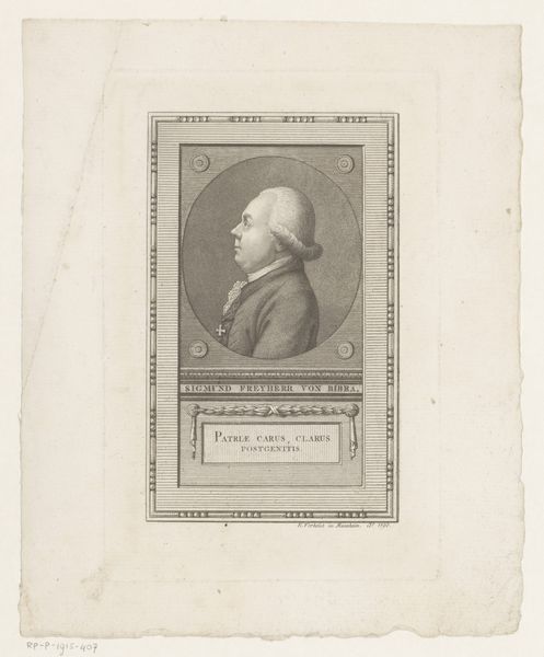 Editor: This is "Portret van Anne Robert Jacques Turgot," made sometime between 1776 and 1787. It’s an engraving and print now held at the Rijksmuseum. There's a formality to it, almost cold, but with an elaborate frame. What catches your eye? Curator: What interests me is the context in which prints like this circulated. Consider Turgot, a prominent economist and statesman in pre-revolutionary France. This portrait, in its engraved form, served as a form of political representation. It was a controlled image disseminated to shape public perception. Editor: So, it's not just about capturing his likeness? Curator: Precisely. The controlled pose, the lettering surrounding the central image--these elements communicate power and intellect. But what kind of power, and for what audience? These prints became commodities that solidified his place within a visual culture consumed by an increasingly literate public invested in political discourse. This print existed because there was a market, fuelled by debates circulating among the populace about economics and power structures. What do you notice about the framing? Editor: It feels quite opulent, definitely not aimed at the poor. The grapes, the decorative swirls...it’s presenting him as successful. Curator: Exactly. So it prompts the question, was this image successful in its time? Considering Turgot's eventual fall from power, we might see this print as revealing the complex relationship between image, power, and political fortune during a period of immense social change. Editor: It’s amazing to consider all these layers beneath the surface of what seems like a straightforward portrait. Curator: And it reminds us that even seemingly simple images have the capacity to act as powerful cultural and political agents.