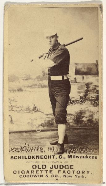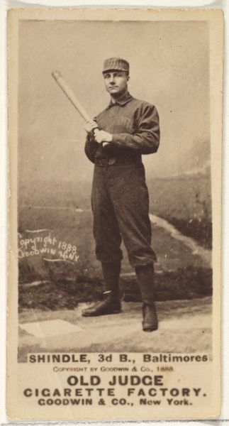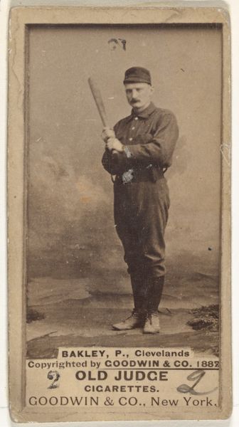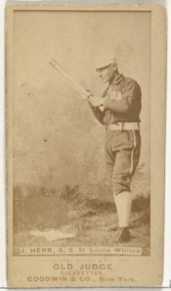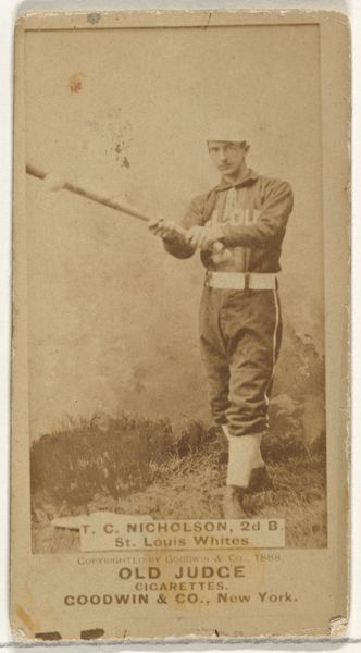 Curator: Here we have an albumen print dating from between 1887 and 1890, produced by Goodwin & Company as part of the Old Judge Cigarettes series. It features pitcher Ed Sproat of the St. Louis Whites. Editor: It's remarkable how the sepia tones give it an antiquated feel, and the composition is intriguing; it’s as though Sproat is caught between action and contemplation. Curator: These cards were inserted into cigarette packs, which makes the relationship between leisure, commerce, and popular culture quite explicit. The distribution mechanism alone offers a powerful commentary on late 19th-century America. Editor: Exactly. And look closely at the textures – the grainy background contrasting with Sproat’s smoothly rendered uniform. It screams materiality. The cigarette manufacturers appropriating images of athletes points directly to a capitalist engine needing fuel, churning out commodities for mass consumption. Curator: Absolutely. This speaks to the commercialization of sports and the use of celebrity endorsements. Think about the working-class consumer of these cigarettes; owning an image of Ed Sproat, they gain a perceived connection to a local hero, a St. Louis icon. Editor: Not only that, it elevates the labor of these athletes and commodifies their image as collectible ephemera, reinforcing their place in a growing leisure market. Consider the resources funneled into cigarette production against the limited access for sporting opportunities. Curator: That interplay is fascinating! And also to consider, what sort of aesthetic conventions were in place when making a picture of a baseball player. The somewhat blurry landscape versus the clear baseball uniform on the body of Ed Sproat, for instance. Editor: Seeing how this small card, mass-produced for profit, captured and commodified the athletic physique opens a dialogue about consumption and production, of tobacco and athletic hero worship. The means by which these photos came into existence, circulated, and now archived offers an insight into art production itself. Curator: Indeed. It really pushes us to rethink traditional boundaries between fine art, sports ephemera, and social history. It has transformed my understanding, thank you. Editor: A very insightful object and a great conversation, broadening perspectives on materials and socio-economic status, and art.