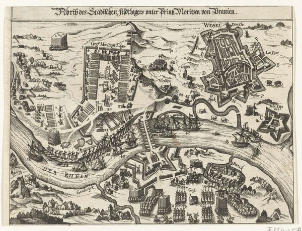 Curator: Immediately striking is the meticulous detail, a real tapestry of textures created purely with line and tone. It has this intense, almost dizzying bird's-eye view. Editor: You're right. It's all about detail here. We're looking at the title page of "Historisch Verhael," volume one, part two, created by Claes Jansz. Visscher in 1622. It's an engraving, likely printed using ink on paper. It documents events unfolding across Europe. Curator: It is fascinating how Visscher uses these precise lines and hatching to build depth and form. He gives us two maps—cityscapes actually—of Montauban and Franckendal. It looks like these urban environments have been carefully rendered to showcase fortifications; all those linear fortifications against the curvilinear, meandering rivers that cut through it. There is even a little fleet shown in the top left! What kind of paper are we talking about here, and the dissemination of its production at the time, can we understand more about this choice? Editor: These engravings were incredibly important tools for disseminating information widely. The "Historisch Verhael" aimed to chronicle significant events across Europe, from September 1621 to April 1622. Its availability and accessibility to a growing merchant class made it a form of media and propaganda; maps, illustrations and titles could offer insights into Dutch perspectives on war and geopolitics, and consumption trends. Curator: Yes, definitely. What do you think is the impact and reach that this type of historical rendering offered its direct public? Editor: Well, Visscher's artistic and printing practices represent not only refined skill, but reflect the flourishing market for printed materials and their societal roles during the Dutch Golden Age. Visscher owned his own printing company, which could speak to both his output of original artworks and also commercial intent. The production means would allow news to spread about historical chronicles throughout regions during its historical time frame. Curator: A lot of historical background comes into play here with this single book cover, then. It’s very easy to get lost within these historical imprints. Editor: Agreed. By looking beyond the surface of composition, and understanding this engraving as part of an early form of mass media helps decode a cultural and social meaning behind its historical narrative.