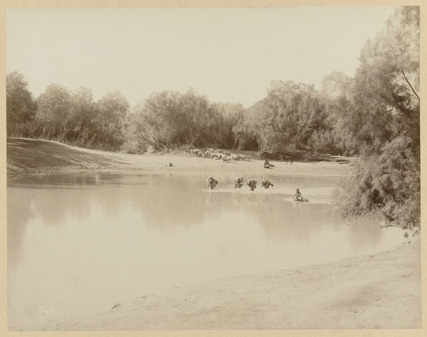 Editor: This albumen print, "Cours du Jourdain," by Félix Bonfils, made in the 1870s, possesses such a still, quiet mood. The tones create a soft sepia dreamscape. What’s your read on this work? Curator: It's intriguing to consider Bonfils's work through the lens of French Orientalism of the time. Photography offered a seemingly objective "window" to the East, but how objective was it really? These images often reinforced European colonial perspectives and cultural hierarchies. Editor: How so? I mean, it just looks like a man with his mule. Curator: Consider the audience for these prints. They were largely consumed in Europe, feeding a desire for exotic landscapes and people. Bonfils, like many photographers working in the Middle East, often staged his scenes. Think about the figure positioned there; he's likely a local hired to complete a particular visual expectation of what the “Orient” should look like. Do you think he might have included the indigenous figure in the landscape for another purpose beyond depicting local reality? Editor: Hmm, I see. The presence of the man does seem staged and adds a layer of romantic exoticism. So, Bonfils wasn’t merely documenting; he was constructing a narrative for his European viewers? Curator: Precisely! The act of photographing itself was deeply embedded in a colonial context. French viewers' understanding and political attitude toward the Middle East were formed partly by consuming art like this. The medium perpetuated their notions. Editor: It’s eye-opening how a simple image can be loaded with so much historical and cultural baggage. Curator: Indeed! It highlights how museums are a place where cultural power can reinforce specific views; these photographs tell a story, but not always an accurate one. Editor: This makes me look at 19th-century photography in a completely different light. Curator: Exactly! Considering art as a product of its time and place, influenced by socio-political dynamics, enriches our understanding immensely.