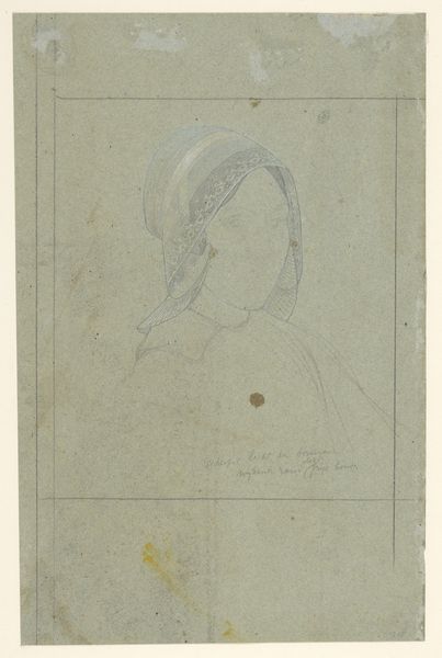 Curator: It feels a little… haunted, somehow. Just a trace of a person. A memory rendered in faint, reddish lines. Editor: Indeed. What you’re perceiving, I think, is the spectral quality of a photogravure. This piece is a photographic reproduction, dating from before 1877, of a portrait of Frances Grey, Duchess of Suffolk, after Hans Holbein the Younger. You can find it here in the Rijksmuseum’s collection. Curator: Photogravure, so not even a direct observation, but a copy of a copy! Still, those Tudor portraits always get me. It's like gazing across a chasm of centuries into the eyes of someone who existed amidst such intense political drama. Did she know what Holbein’s portrait would mean to later generations? Editor: Her position placed her right at the heart of Tudor dynastic struggles, and that very vulnerability, you could argue, makes these portraits potent. It speaks volumes about power, representation, and historical narrative that we are engaging with it now. Curator: The stark simplicity adds to that feeling, don't you think? It’s more like a sketch, revealing the structure. A whisper of a face emerging. The washes remind me of frescoes. There is also that barely-there presence created by the line quality which feels fragile but also enduring, you know? A reminder of her humanity. Editor: Absolutely. It strips away the grandeur and lets you glimpse something perhaps more truthful, or at least, less ornamented. In its time, portraiture like Holbein's fulfilled multiple functions, legitimizing power, creating an image, or constructing a personal brand, and in reproductive media the cultural and economic values have clearly shifted with changing historical contingencies. Curator: Seeing her now in this somewhat diminished, copied form prompts some thoughts on art history as layers upon layers of representation, distortion, and… survival. Editor: A pertinent reflection, I think. Every encounter with an historical object carries the traces of its journey. A journey that ends at that very moment when we gaze upon it now, reinterpreting its power.