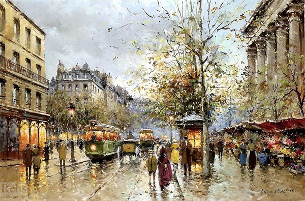 Antoine Blanchard created this painting of the Boulevard des Capucines et Madeleine, using oil paint, a medium that can be blended and layered for luminous effects. Blanchard evokes a scene from Paris’s belle époque. Look at how the thick application of paint conjures the bustling street life and imposing architecture. The brushstrokes, with their inherent texture, suggest movement and a certain ephemeral quality, capturing a moment in time. The artist’s technique and skill, evident in the way he handles the paint, reflect a long tradition of academic painting. The labor-intensive process—from stretching the canvas to meticulously layering the paint—speaks to the value placed on artistic skill. The painting offers a romanticized vision of urban life, one perhaps consumed and desired by the bourgeoisie. Ultimately, considering the materials, the making, and the cultural context helps us understand how a painting like this transcends mere representation, inviting us to reflect on themes of nostalgia, progress, and the changing urban landscape.