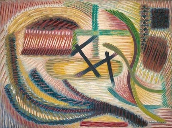 Editor: This is Josef Capek’s "Zátiší," painted in 1922 using oil paint. It definitely has an expressive, almost jarring quality with its sharp geometric shapes and contrasting colours. What strikes you when you look at this painting? Curator: I am immediately drawn to the dynamic interplay between geometric forms and organic shapes. The structure suggests a conscious organization, yet there's an expressive energy conveyed through the brushstrokes and colour choices. Editor: Can you expand on that a bit more? Curator: Certainly. Observe how Capek uses the juxtaposition of angular lines and softened curves to create visual tension. The interplay of the vase, background and table create dynamic planes across the canvas. These semiotic signifiers suggest depth without using conventional techniques. Notice, for instance, how the reflections mirror and invert to play with this sense of space. Do you see how the expressionist strokes enhance the dynamic tension in the overall composition? Editor: I do. It is like there’s a conversation between rigid geometry and fluid forms, particularly when considering the zig-zag designs. What does it mean that everything seems angular, like even the vase and flowers follow hard lines and edges? Curator: I see it as Capek testing the boundaries between abstraction and representation. These are structural choices, the product of which are the tensions felt while viewing this piece. Editor: So it is through line, shape and colour choices that the artwork conveys its message? Curator: Precisely. Capek's formal approach encourages us to focus on these intrinsic visual elements and how they coalesce to create meaning. The geometric idiom provides a rigorous framework for the painting, from the division of planes, down to each singular line and brush stroke. It makes you consider, in short, how structure embodies its message. Editor: That is insightful. I never considered how closely form and meaning can be interwoven.