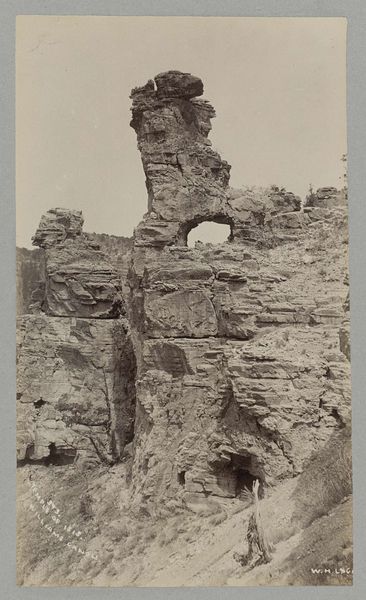 Curator: This intriguing photograph, taken around 1866 by Isidore Kinsbergen, captures Candi Jabung, a 14th-century brick temple in East Java. What’s your immediate reaction to this image? Editor: It feels incredibly solid, imposing even in its partially ruined state. You can sense the weight of the bricks and the structure's enduring presence despite time and apparent neglect. The ladder, haphazardly leaning against it, also makes me consider the labor required to build this temple and later attempt restoration. Curator: Indeed. The image encapsulates a tension between endurance and decay, prompting questions about how we engage with cultural heritage across vast spans of time and changing power structures. How do we negotiate the impact of colonialism in the excavation, documentation, and preservation of sites like Candi Jabung, and whose voices are prioritized in these narratives? Editor: Precisely. Look at the detail in the brickwork—that kind of craftsmanship speaks to immense skill and specialized labor. And of course, bricks are made of clay: literally of the earth, transformed through firing into something enduring. The process itself tells a story of technological knowledge and human ingenuity. Curator: And I can’t help but consider the original intention behind the temple’s construction. The sculptural details, even in their worn condition, suggest devotion, a specific iconography relating to local beliefs and power structures. This photograph provides valuable material evidence of East Java’s complex religious and political history, but interpreting it requires us to engage with postcolonial discourse that respects Southeast Asian perspectives on cultural identity. Editor: Absolutely. We have this image through a specific lens—Kinsbergen's colonial gaze, recording it at this moment of partial collapse. Now the contemporary work involved in archiving, documenting, and maintaining it requires different labor still. It really layers questions about preservation, commodification and what materials mean for society today. Curator: Ultimately, Kinsbergen’s photograph serves as a potent reminder that understanding art requires sensitivity to historical power dynamics, social contexts, and a nuanced recognition of cultural identity. Editor: And acknowledging the concrete processes—both physical and sociopolitical—involved in preserving our complex histories.