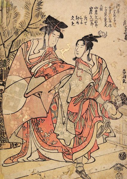 Curator: Well, this looks intriguing. Editor: Indeed. What we’re viewing is titled "The Ninth Month," a woodblock print in ink and color by Katsushika Hokusai, created around 1793. It's part of the collection at the Minneapolis Institute of Art. My first impression is that the piece feels intimate, domestic even, despite being a printed medium rather than a unique painting. There's a softness, a gentle elegance to the composition and line work. Curator: I agree about the intimacy. The choice of woodblock printing allows for the wide dissemination of such scenes, bringing glimpses into the lives of these figures, these refined commodities, into the hands of a broader public, and playing a crucial role in popularizing Ukiyo-e prints. The visible grain of the wood itself, even through layers of ink, speaks to its production and consumption. Editor: And it's interesting to consider the social function of prints like these. They depict courtesans and everyday life, effectively acting as visual documentation of contemporary culture but simultaneously shaping perceptions and reinforcing social hierarchies through their distribution and imagery. Curator: Absolutely. The material process inherently shapes its social role. Take the chrysanthemums, for instance. We tend to see these floral elements as mere background details. But to the Japanese populace, they're symbols of longevity and nobility. The fact that these attributes are deliberately situated around people makes us question their social status, whether through hard labor or through their status of nobility. Editor: It's all deliberately curated by Hokusai and his production teams to not only capture a likeness but also transmit cultural values and subtly promote status. The arrangement also implies narratives. Are we witnessing a scene of companionship, service, a fleeting interaction within a larger social space? It encourages speculation, it gives viewers a peek into a world just out of reach for some, aspirational perhaps. Curator: Precisely, aspirational because there's a craft at play in producing such pieces, the artisan who must cut away all areas except for the lines. By using print rather than painting, a means of mass production that would have impacted what an artist in this era can truly produce. The value wasn't so much tied to what could have been created with ink, brush, and paper, but to how they managed and oversaw the making and production of these artworks, where their social impact might lay. Editor: Examining the social context and how production informs reception… That has truly deepened my understanding. Thanks for illuminating those processes. Curator: My pleasure, considering the materials and mode of creation provides rich insights.