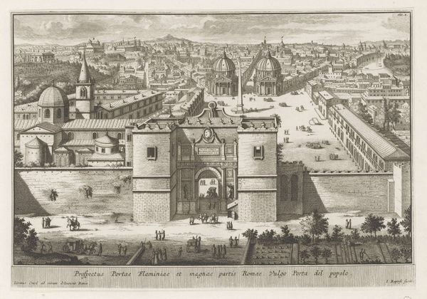 Curator: This print, "View of a Palace with Inner Courtyard on the Left and Facing Garden with Fountain," is attributed to Joannes van Doetecum. It captures a rather elaborate architectural scene, doesn't it? Editor: It does! My initial impression is one of rigid formality, an almost stage-like setting, yet it feels strangely unreal, more a dreamscape than an actual place. Curator: Notice how the artist uses perspective to emphasize the palace's grandeur, placing the viewer at a distance, underscoring the power dynamic inherent in such spaces. Editor: Absolutely. The symbols of control are clear: the towering structures, the manicured gardens, the geometric precision. It speaks of a desire to impose order, reflecting societal hierarchies. The figures are so small. Curator: The fountain, the symmetry, the carefully placed figures—it's all part of a visual language of authority and cultivated taste. Editor: Perhaps a reflection of the era’s values—the emphasis on reason, order, and control, but to my eye, it feels cold, detached from lived experience. But then, maybe that's the point. Curator: Indeed. This image serves as a window into understanding the values and aspirations projected onto architectural spaces during this time. Editor: And as a reminder of how those spaces shaped and continue to shape our understanding of power and privilege.