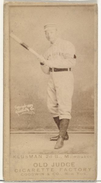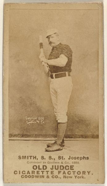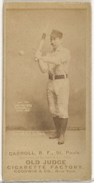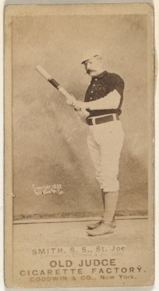 Curator: This photograph, dating to 1889, depicts George B. Treadway, a left fielder for the St. Paul Apostles. It comes from the Old Judge series of baseball cards produced by Goodwin & Company as promotional material for their cigarettes. Editor: The sepia tone gives it such a timeless quality. He looks so poised, almost melancholy, in his baseball attire. The entire composition feels both familiar and slightly surreal, doesn’t it? Curator: Indeed. Consider the societal context of its creation. Baseball was rapidly professionalizing, and figures like Treadway became cultural icons. Yet, these images, intended to promote tobacco, also highlight the intricate links between sports, industry, and early consumer culture, often driven by exploitation of the working class and normalizing dangerous products. Editor: Absolutely. But let’s also consider the visual language. Notice the ball floating suspended mid-air, right beside the bat—a classic symbol of readiness and latent potential. There’s a suggestion of action, a held breath before the swing. Is that a symbol for optimism for this baseball team, or optimism to draw cigarette consumers in, to hook them into this pastime? Curator: I think both, actually. But let's think of that “potential” in terms of larger socio-political metaphors—the Gilded Age boom, and, for whom that supposed rise included and excluded. This image, distributed so widely, perpetuated notions of ideal masculinity and sportsmanship—while eliding complex social issues. It is imperative to remember what messages they were sending by producing it as well, even if he does seem “poised”. Editor: I suppose I see less intentional messaging in these things. Rather, to me, the details carry powerful significance regardless. Take the placement of the words “Old Judge” above Treadway's name; that juxtaposition creates a relationship of authority, almost equating a player with "Old Judge". But regardless of these specific ads, I suppose, capitalism and social pressures had a part to play. Curator: I agree. When we examine this photograph of George Treadway with that deeper context in mind, we confront the layers of meaning inherent in what might first appear a straightforward depiction of a baseball player. Editor: And the echoes of those old symbols still reverberate in our own visual culture. This card becomes a microcosm of enduring aspirations, tensions, and desires in the American story.
